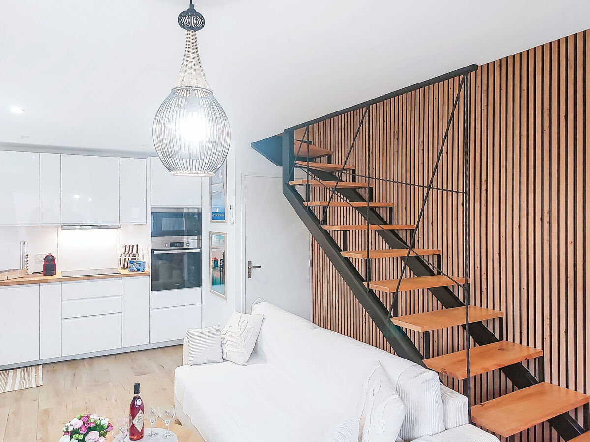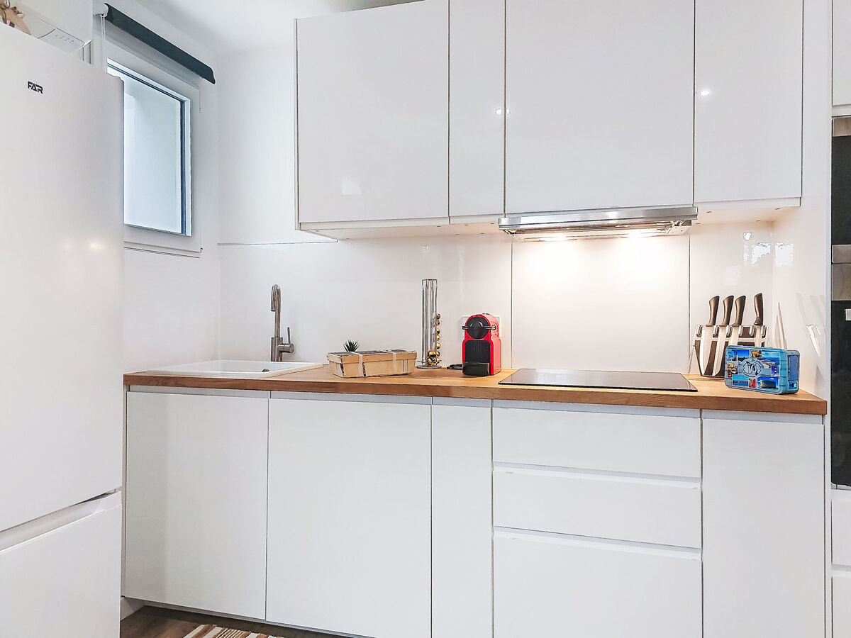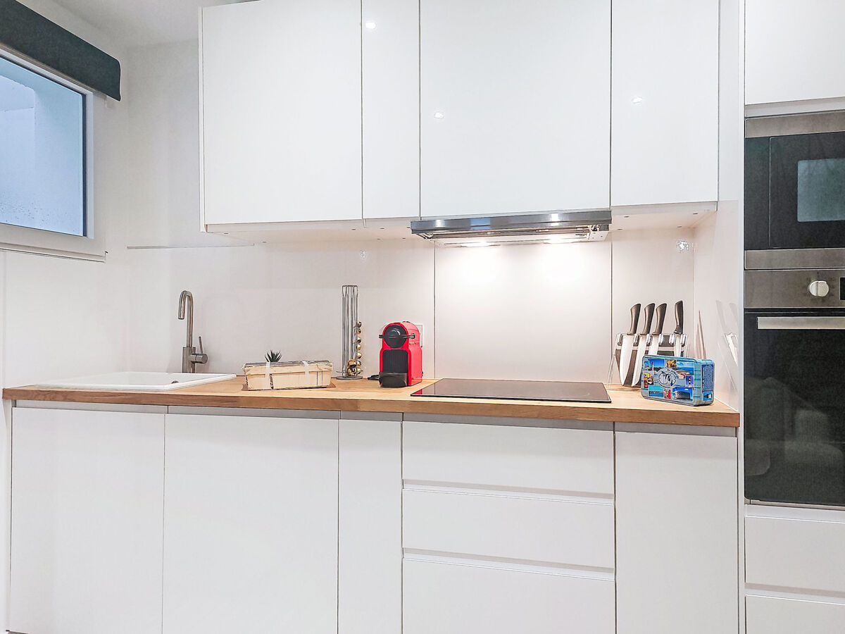 Cuisine ouverte (four, 3 plaques à induction, grille-pain, bouilloire électrique, micro-ondes, cafetière électrique).