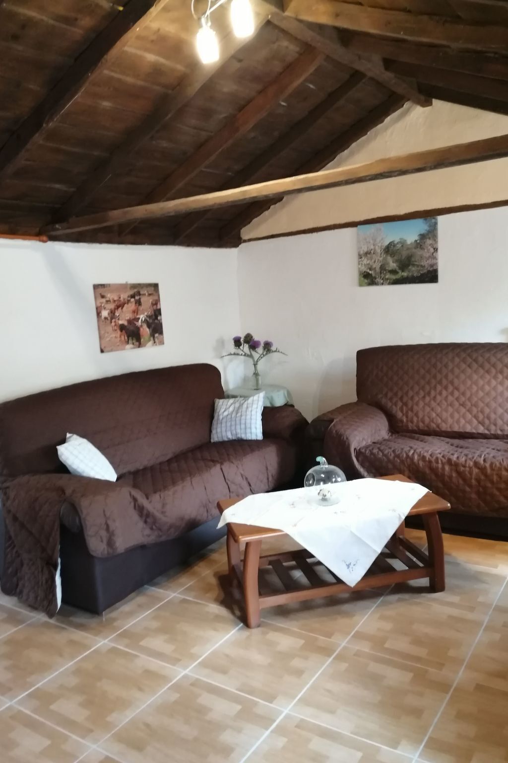 The house has two bedrooms with new beds 2x0.90x2.00m and 1x 1.60x2.0m for a total of four people, a kitchen, a large living room with old Canarian wooden ceiling, and modern flat screen TV via satellite.