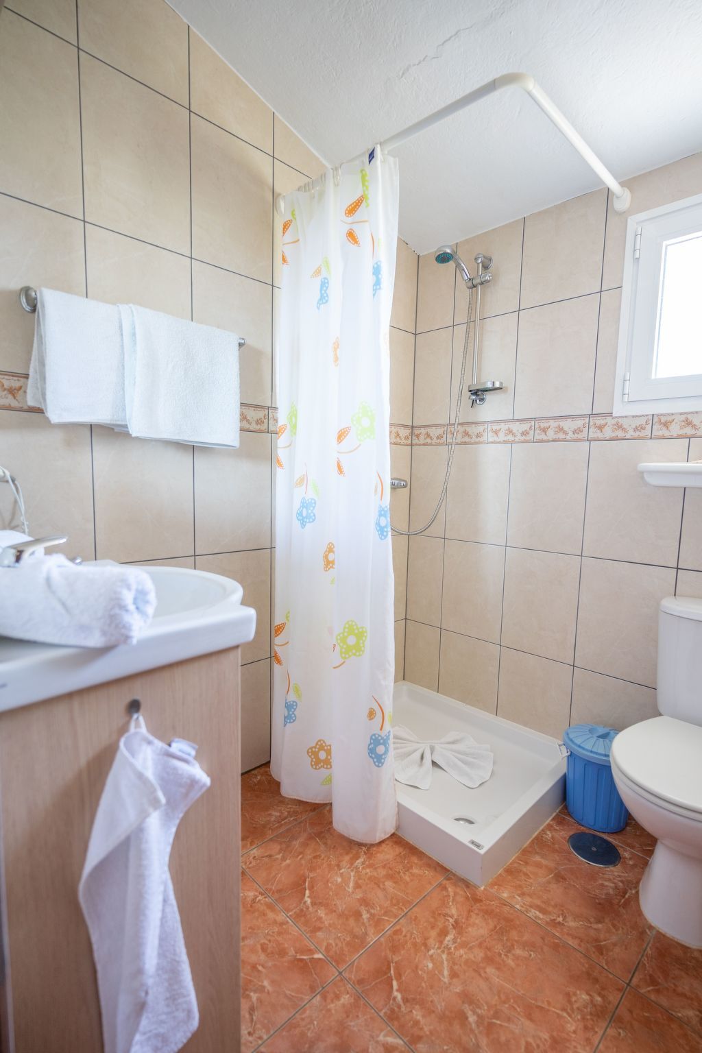 Many shopping facilities as well as pharmacy, post office and restaurants are within walking distance in 5 to 10 minutes, as well as the bus stop from where you can go around the whole island by bus.