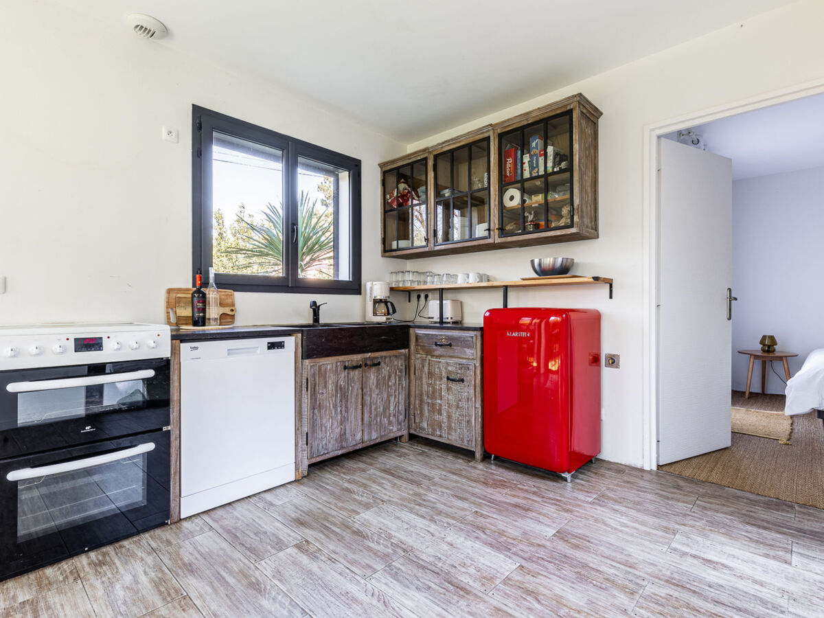 Cuisine ouverte (four, lave-vaisselle, 4 plaques vitrocéramiques, grille-pain, bouilloire électrique, micro-ondes, congélateur, cafetière électrique).