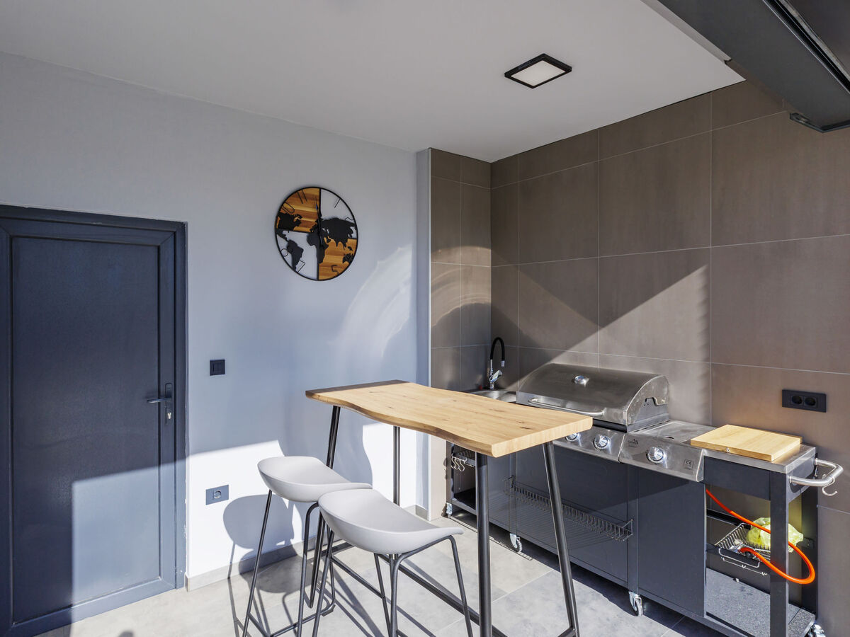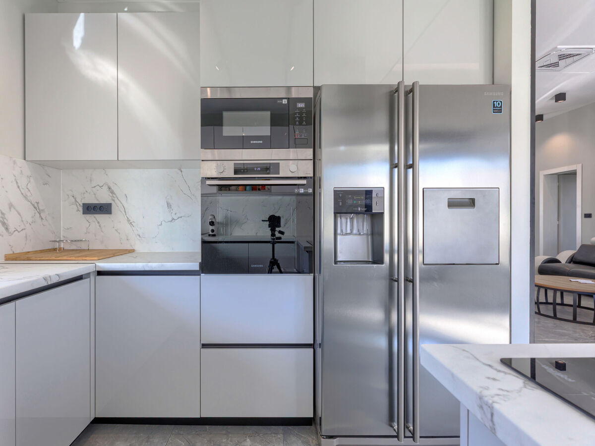 Cuisine ouverte (four, lave-vaisselle, 4 plaques vitrocéramiques, grille-pain, bouilloire électrique, congélateur, cafetière électrique).