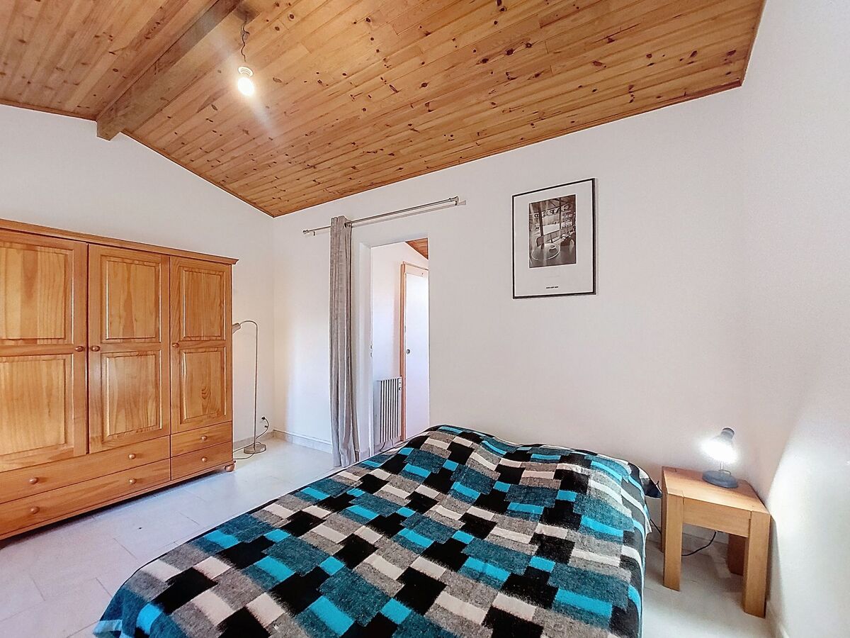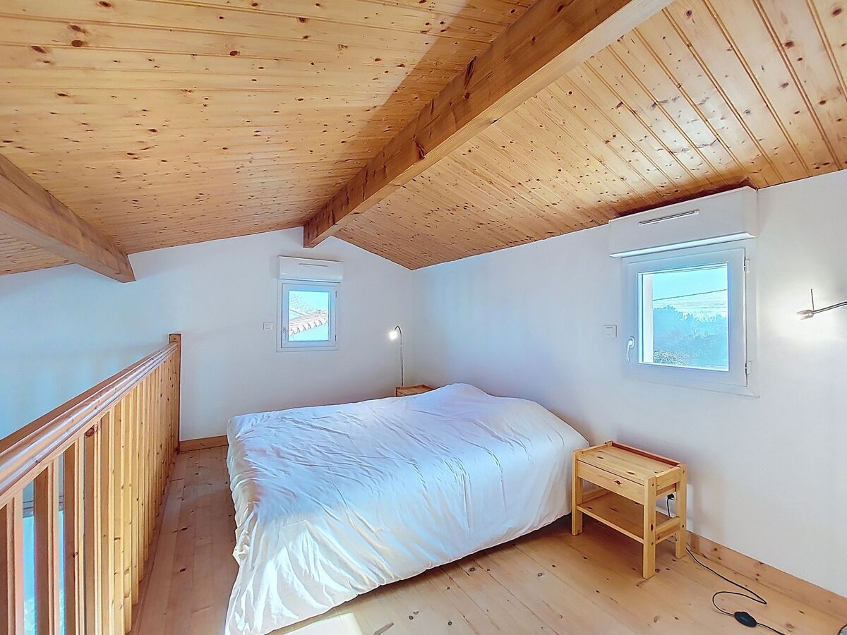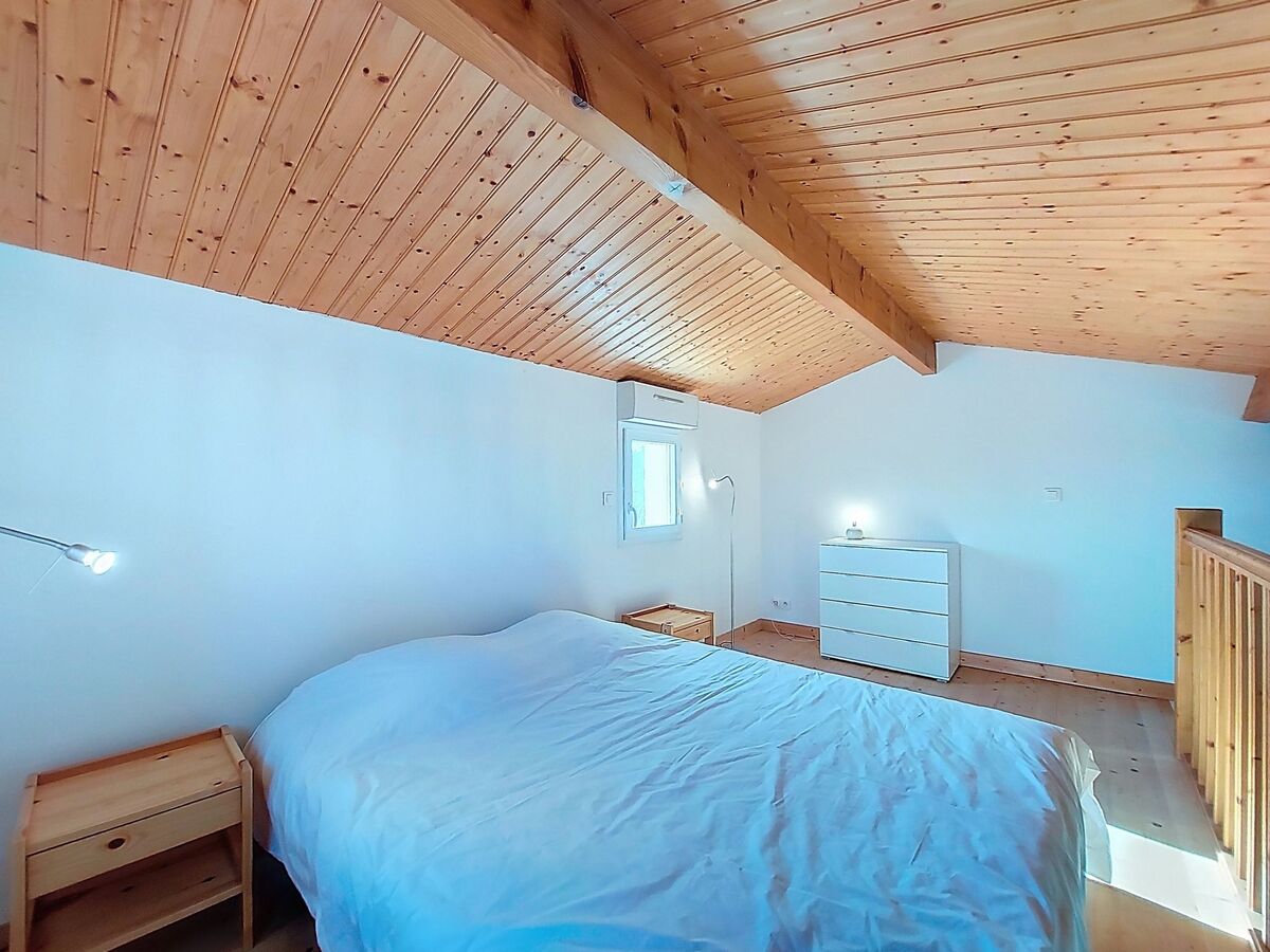 À l'étage supérieur: 1 chambre, mansardée, ouverte avec 1 grand-lit (1 x 160 cm, longueur 200 cm).