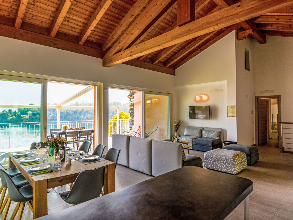 À l'étage supérieur: séjour/salle à manger avec table pour les repas et TV.