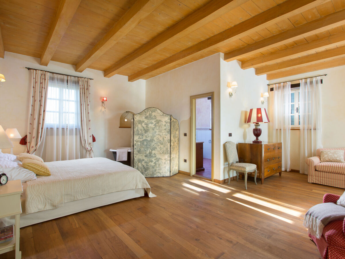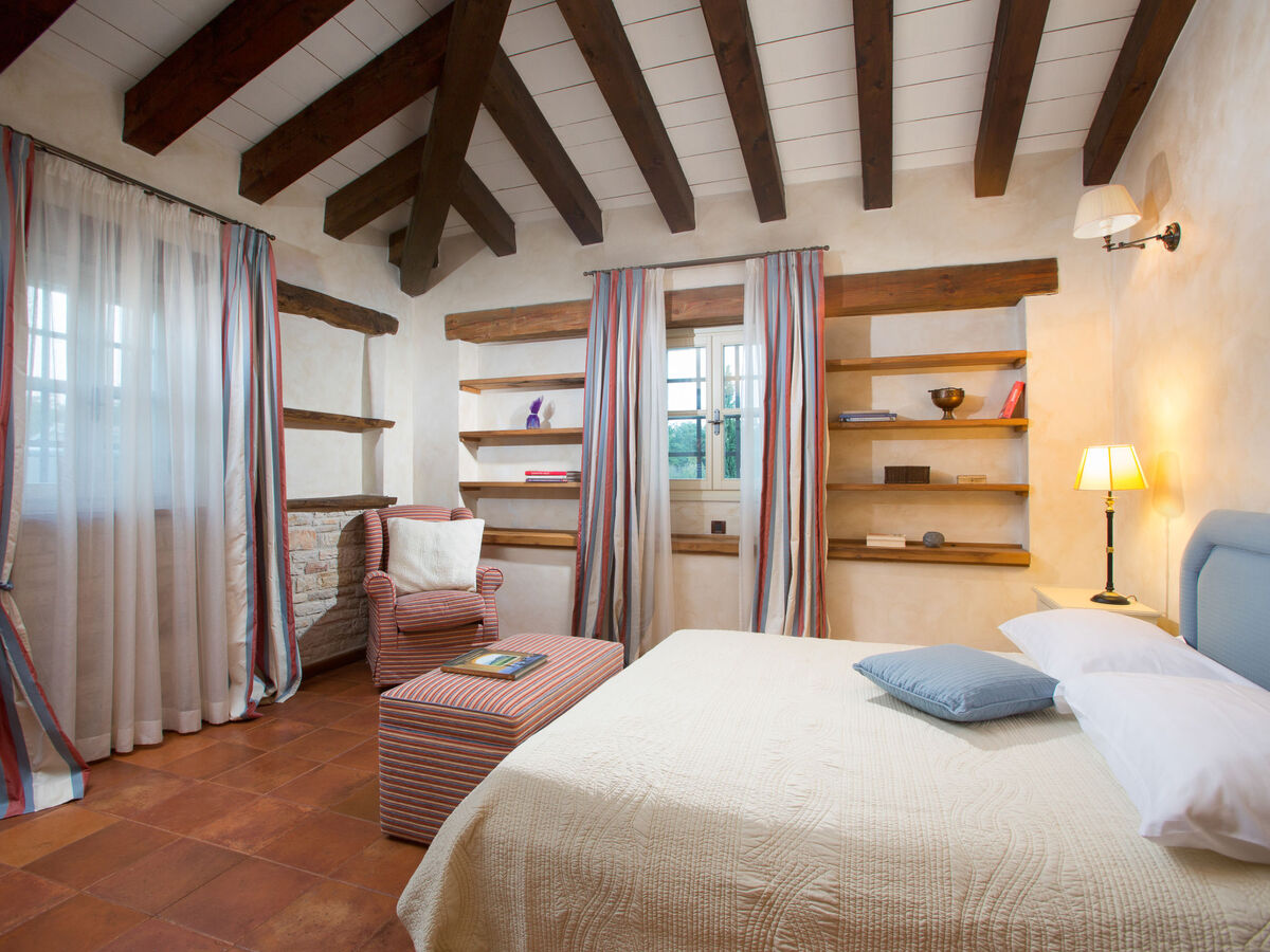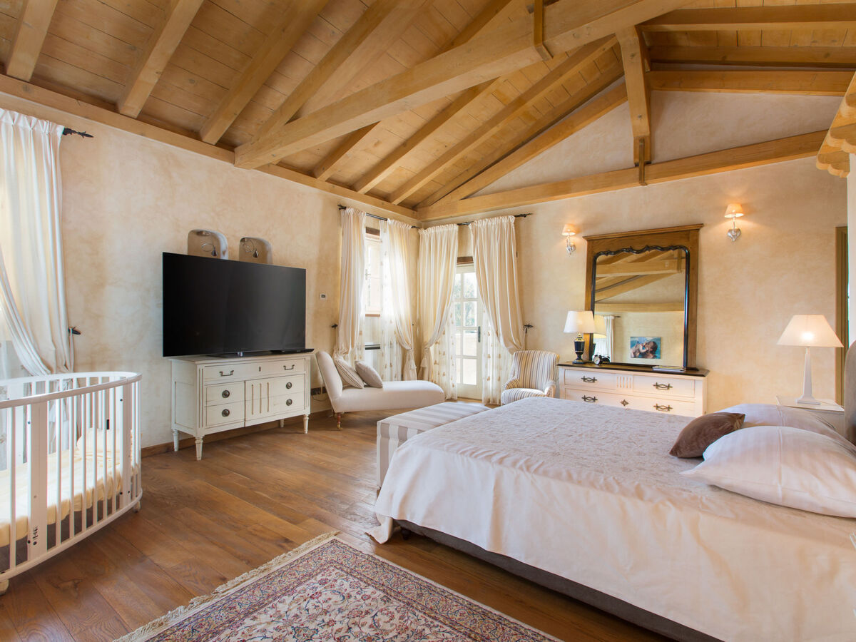 À l'étage supérieur: 1 chambre avec 1 grand-lit (180 cm, longueur 200 cm), bain/douche/WC, TV (satellite) et air-conditionné.