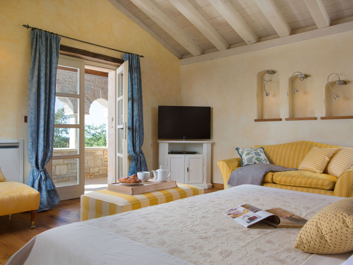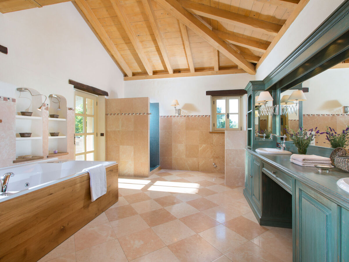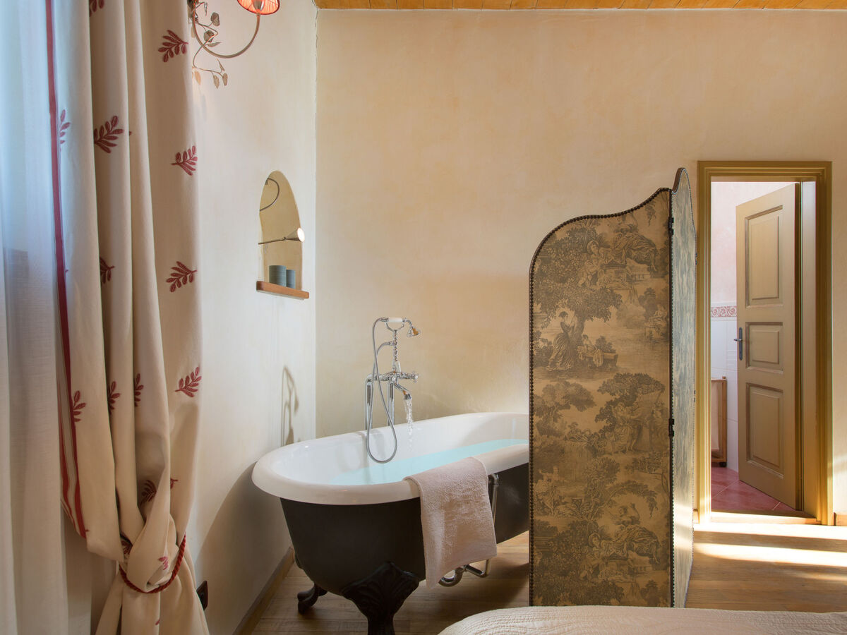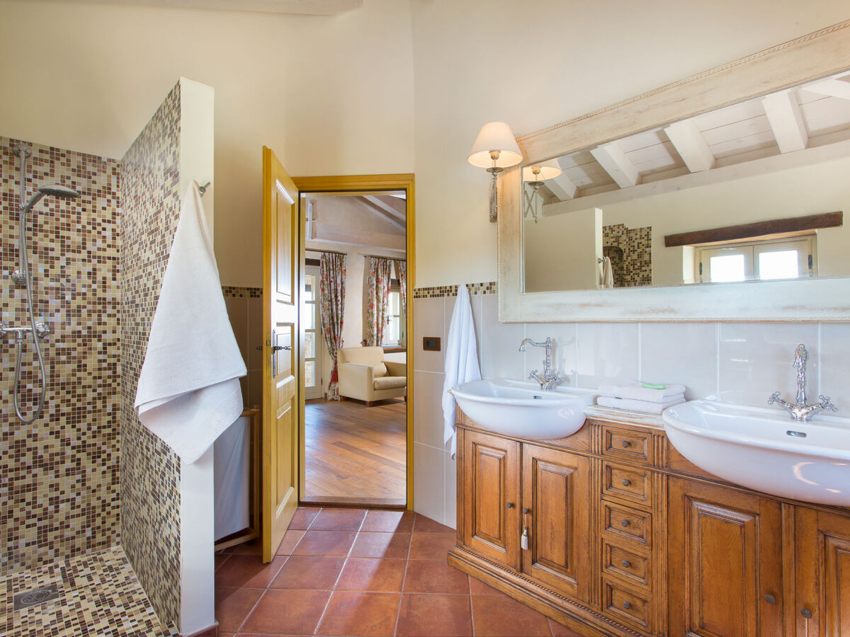À l'étage supérieur: 1 chambre avec 1 grand-lit (180 cm, longueur 200 cm), bain/douche/WC, TV (satellite) et air-conditionné.