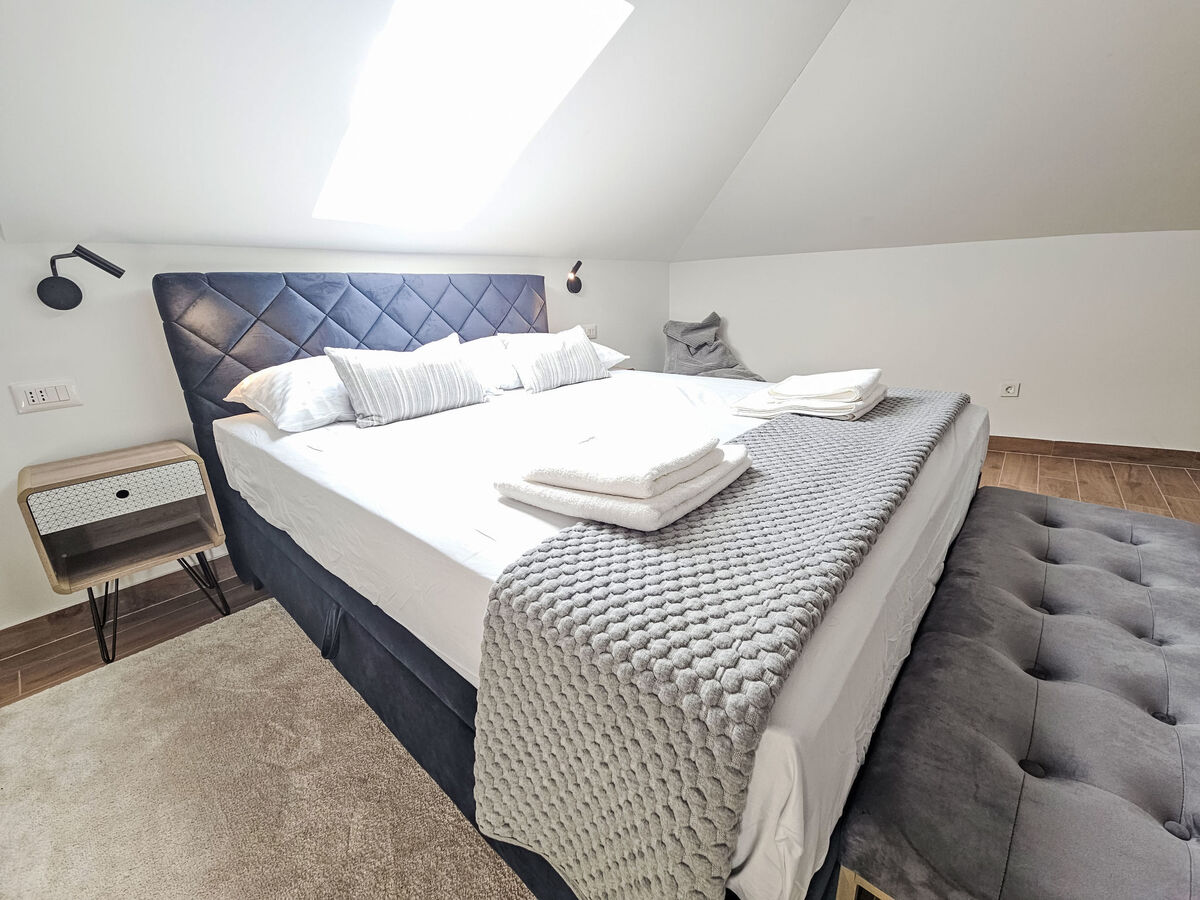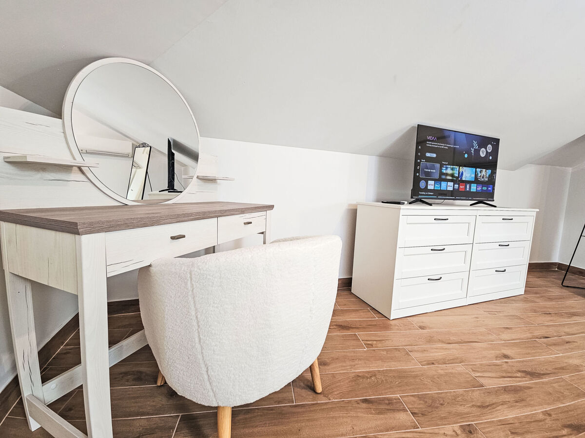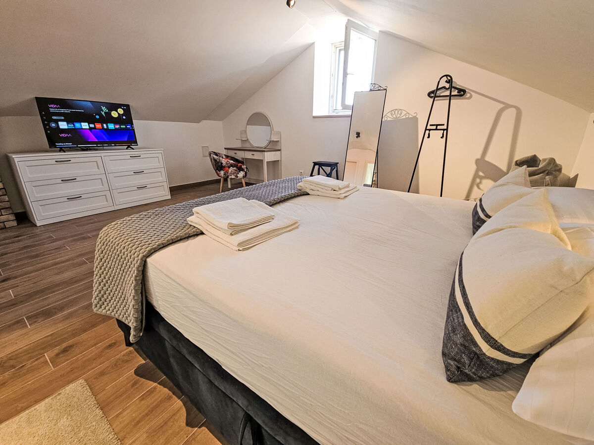 À l'étage supérieur: 2 chambres, mansardées hauteur plafond 130 - 240 cm, chaque chambre avec: 1 grand-lit (160 cm, longueur 200 cm), douche/WC et TV (satellite) (écran plat), air-conditionné.