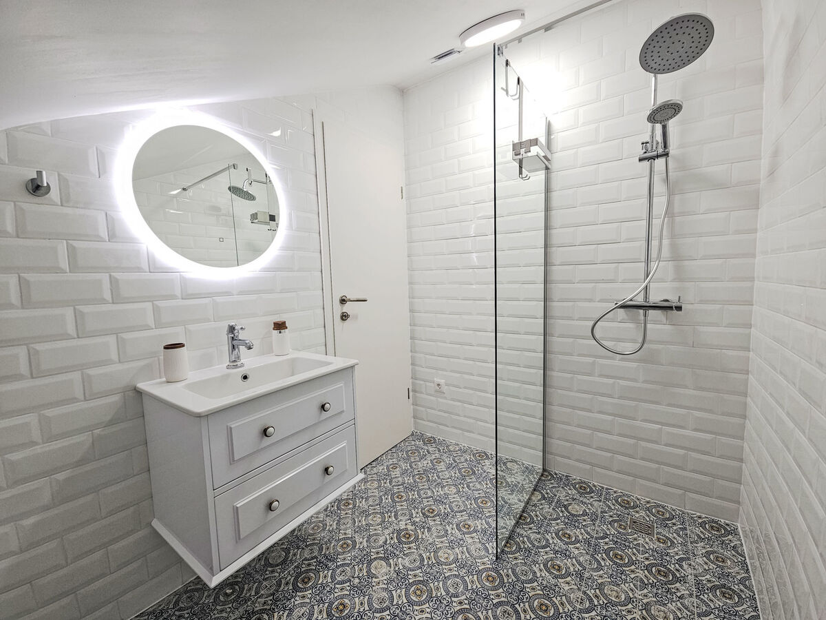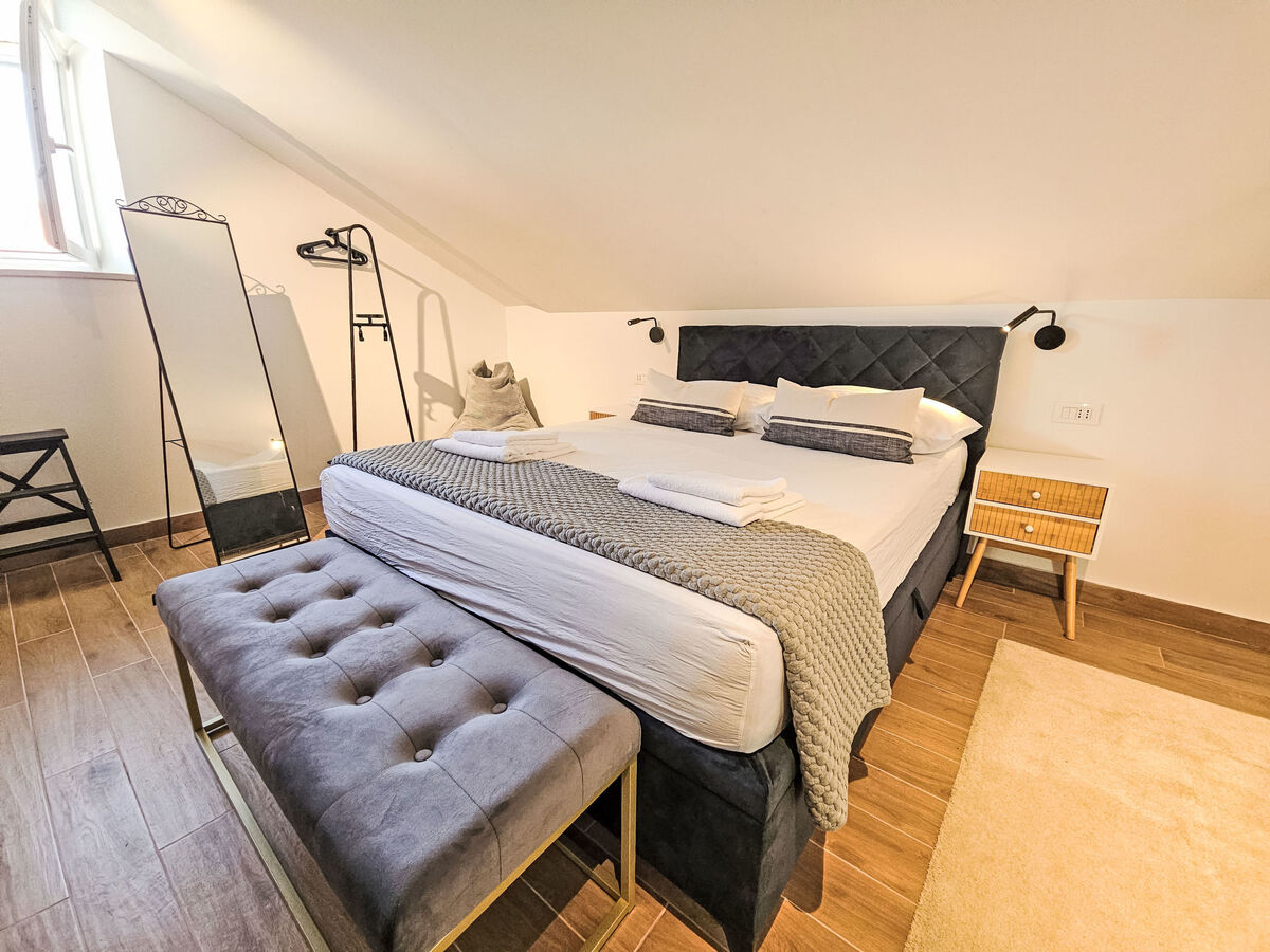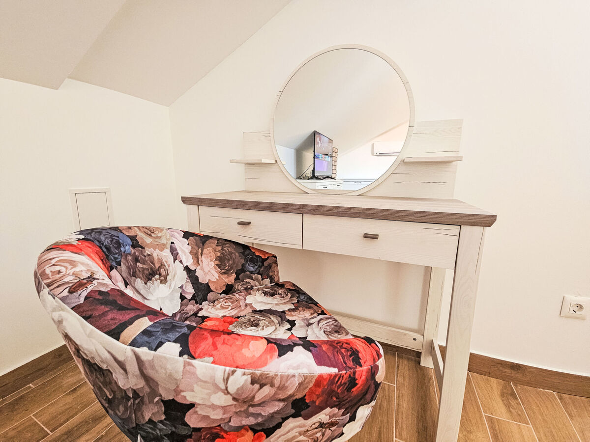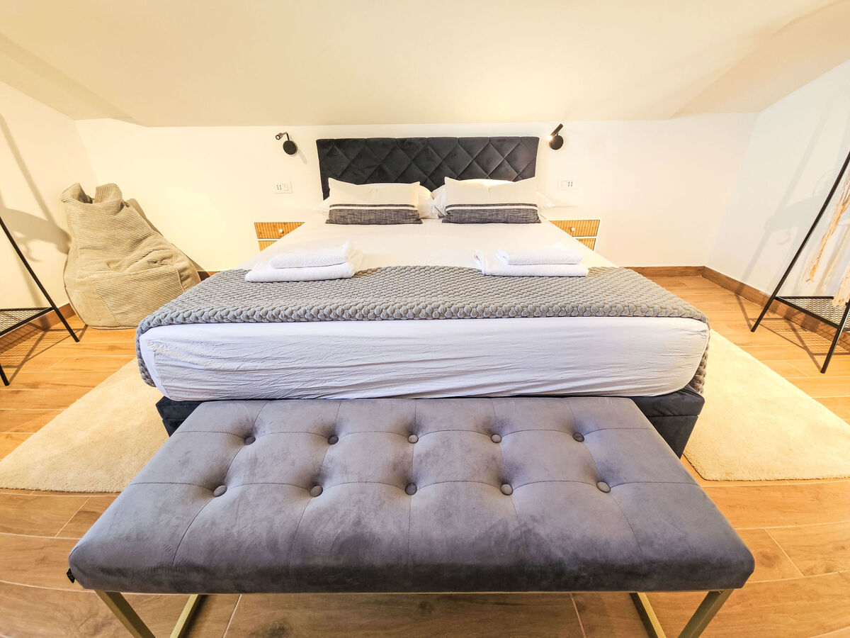 À l'étage supérieur: 2 chambres, mansardées hauteur plafond 130 - 240 cm, chaque chambre avec: 1 grand-lit (160 cm, longueur 200 cm), douche/WC et TV (satellite) (écran plat), air-conditionné.