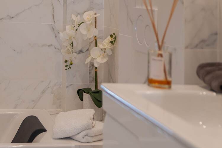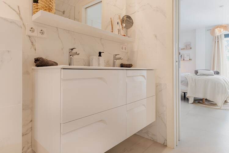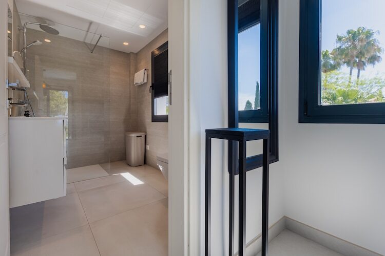 Au niveau inférieur, la suite parentale dispose d’une terrasse privée et d’une salle de bains attenante avec baignoire et douche séparée. Une autre chambre avec sa propre salle de bains se trouve également à cet étage. Un appartement d’invités indépendant offre deux chambres supplémentaires avec accès direct à l’espace piscine, garantissant ainsi davantage d’intimité à une partie du groupe. Plusieurs salles de bains modernes assurent le confort des groupes plus nombreux.