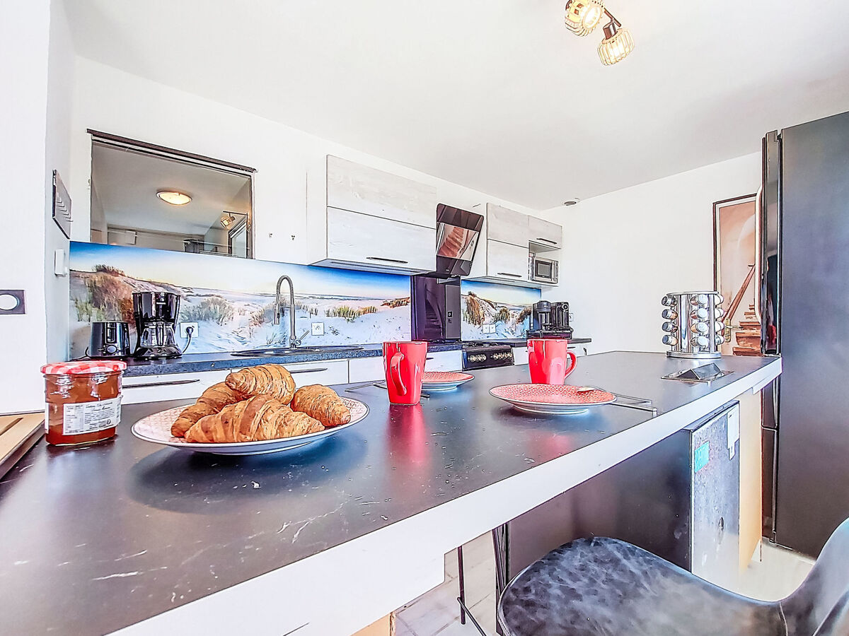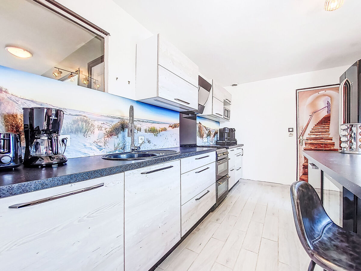 Cuisine ouverte (1 plaque de cuisson, four, lave-vaisselle, 3 feux, grille-pain, bouilloire électrique, micro-ondes, congélateur, cafetière électrique) avec bar.