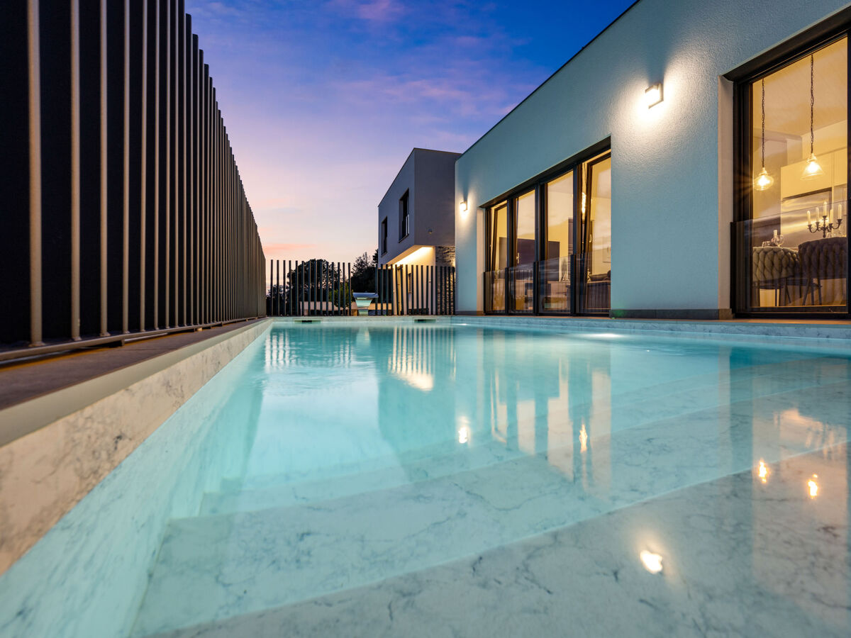 A usage privé: terrain 560 m2 (clôturé), piscine rectangulaire (8 x 4 m, 24 m2, profondeur 100 - 140 cm, disponibilité saisonnière: 15.Avr.