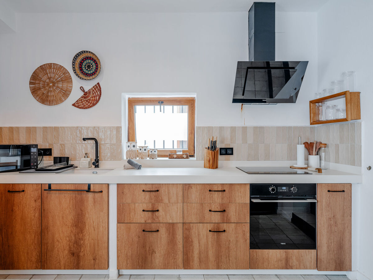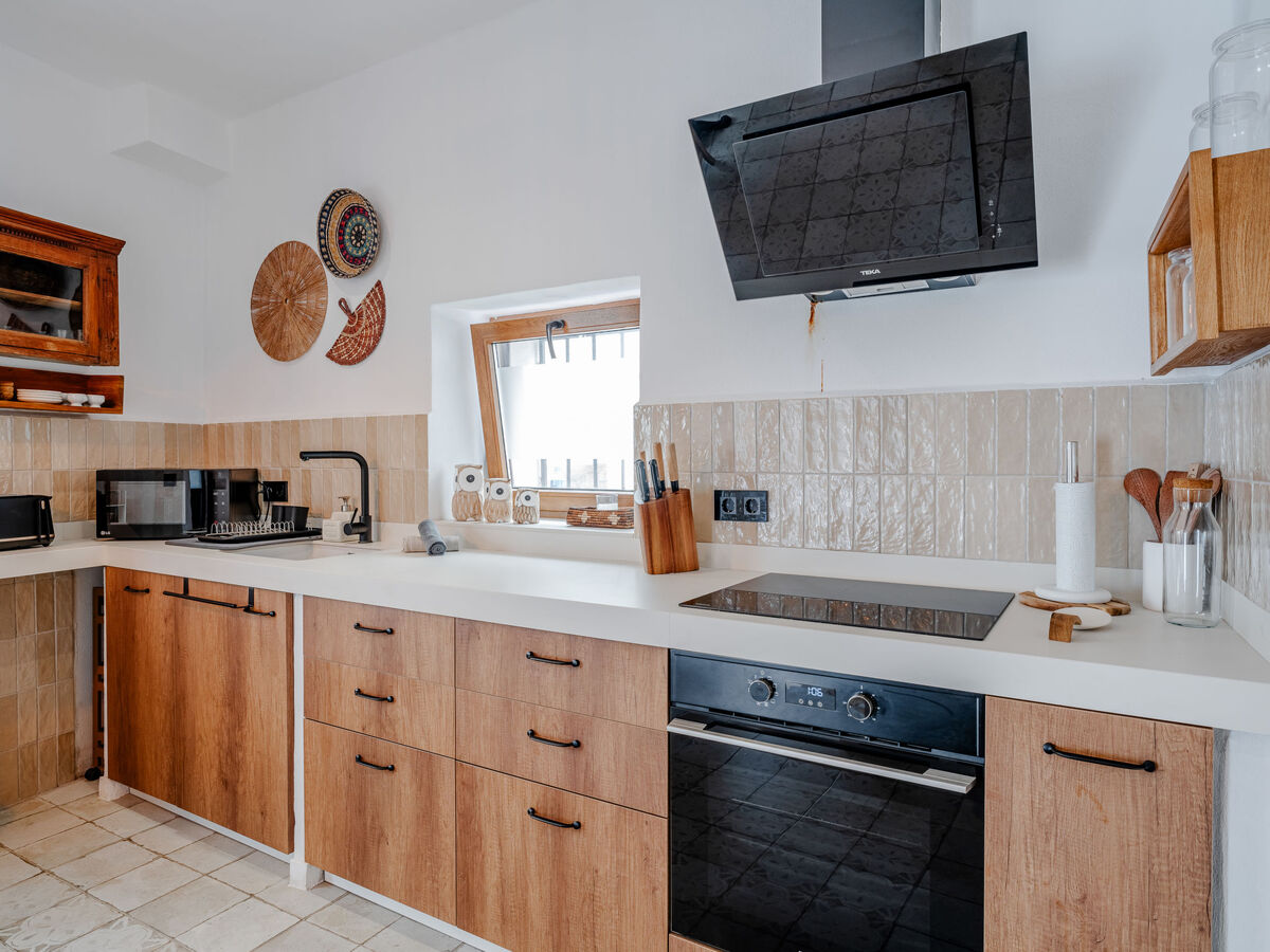Cuisine ouverte (four, 3 plaques à induction, grille-pain, bouilloire électrique, micro-ondes, congélateur, cafetière électrique, Capsules pour machine à café (Nespresso) (NON INCLUSES)) avec ventilateur.
