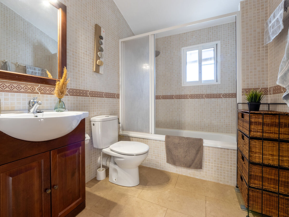 À l'étage supérieur: 1 chambre double avec 1 grand-lit (150 cm, longueur 190 cm), baignoire sabot/WC, TV, air-conditionné, ventilateur et chauffage à air chaud.