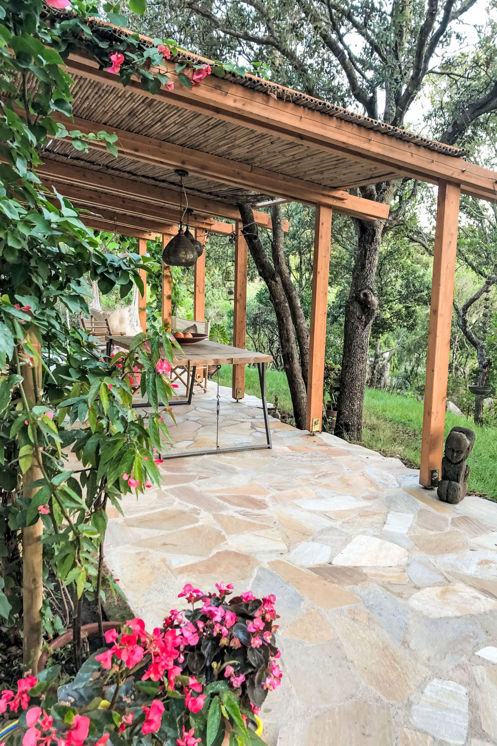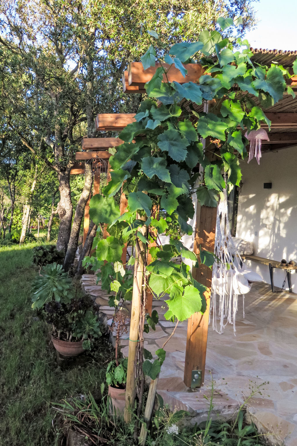 Terrasse 20 m2 partiellement couverte.