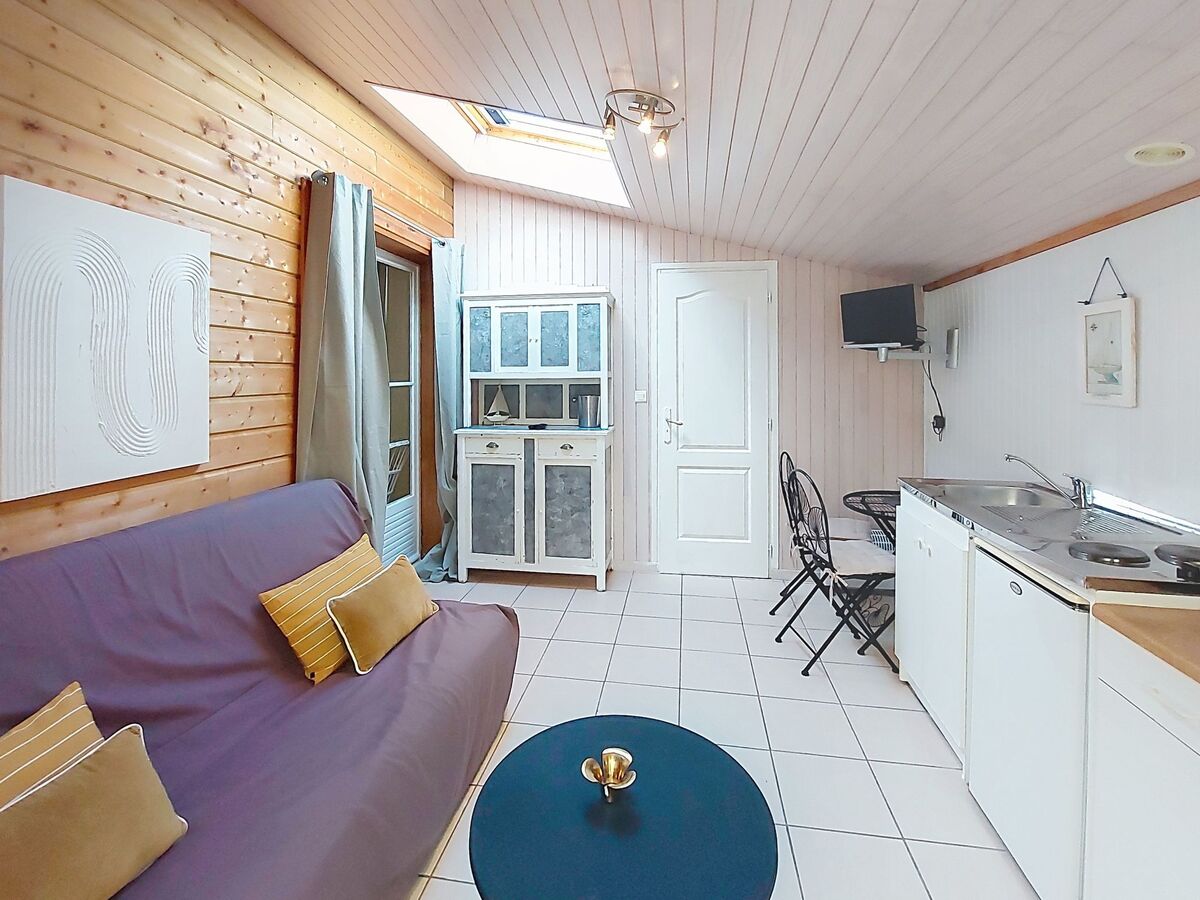 Studio, sans fenêtre avec 1 grand-lit (1 x 140 cm, longueur 190 cm), coin-cuisine, douche/WC et TV (écran plat).