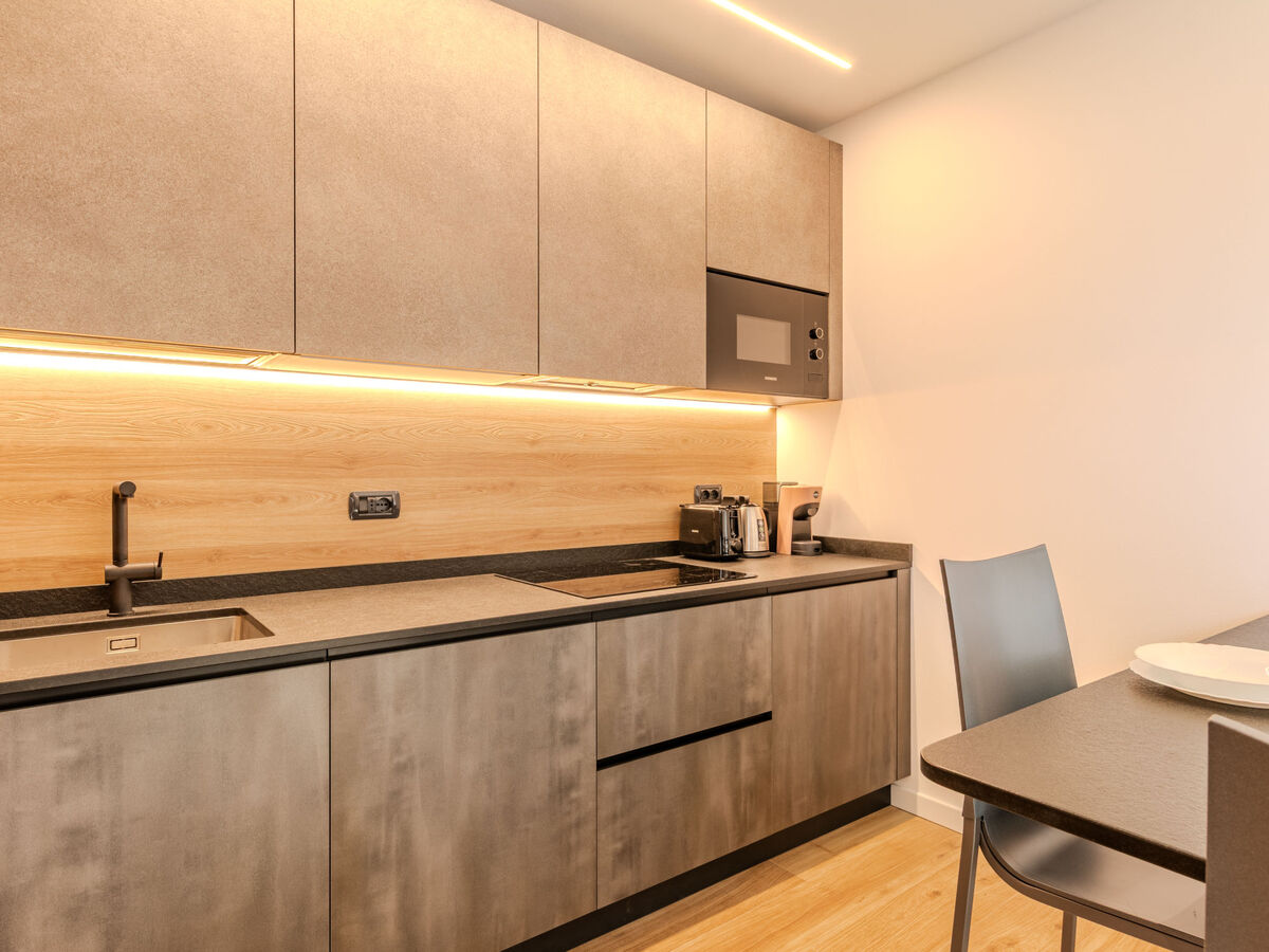 Cuisine (lave-vaisselle, 4 plaques à induction, grille-pain, bouilloire électrique, micro-ondes, congélateur, cafetière électrique) avec table pour les repas.