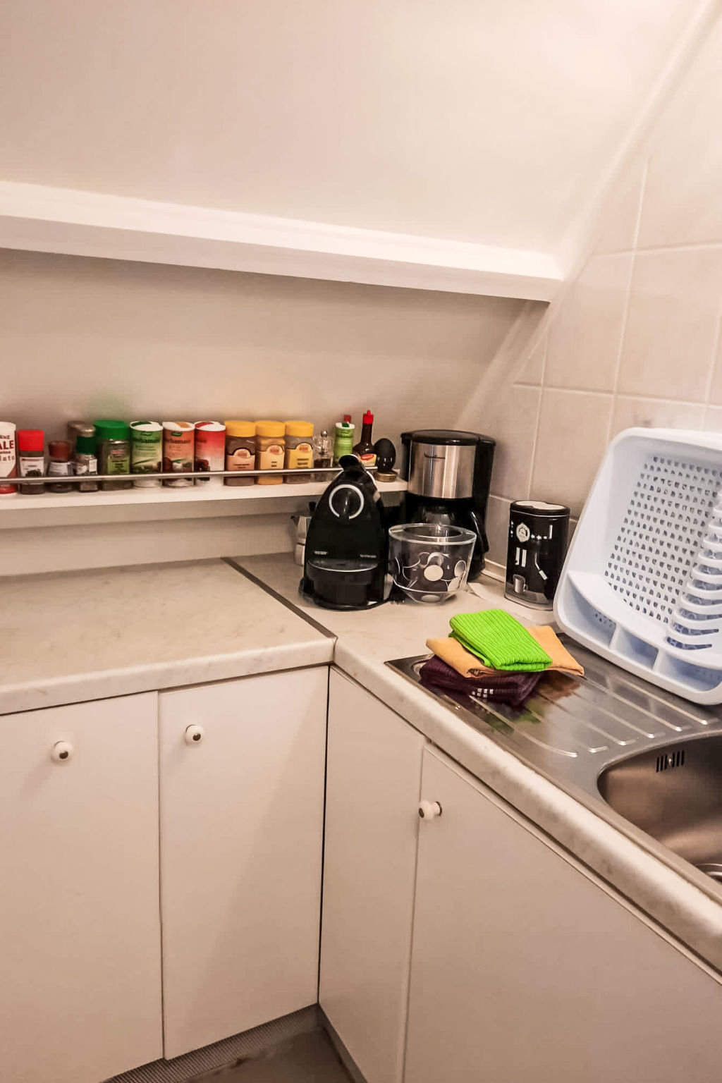 Coin cuisine (four, Poêle à gaz, grille-pain, bouilloire électrique, micro-ondes, congélateur, cafetière électrique).