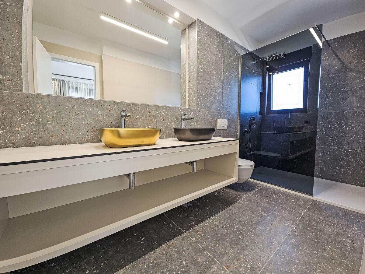 À l'étage supérieur: 2 chambres, chaque chambre avec: 1 grand-lit (180 cm, longueur 200 cm), douche/WC et TV (satellite) (écran plat), air-conditionné.
