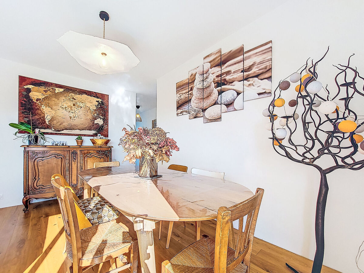 Séjour/salle à manger avec poêle suédois, table pour les repas et TV (écran plat).