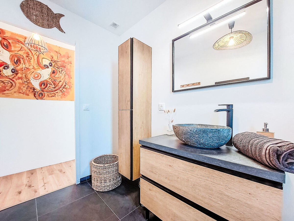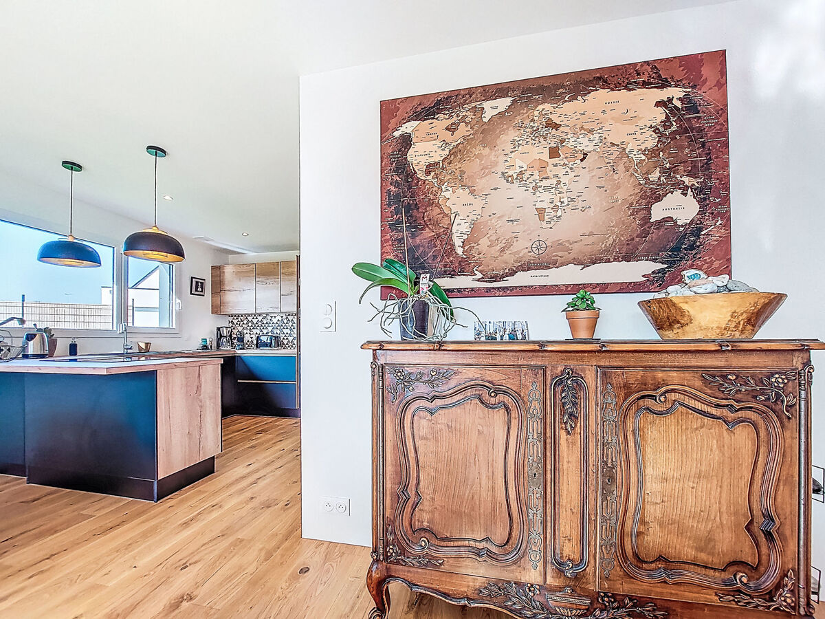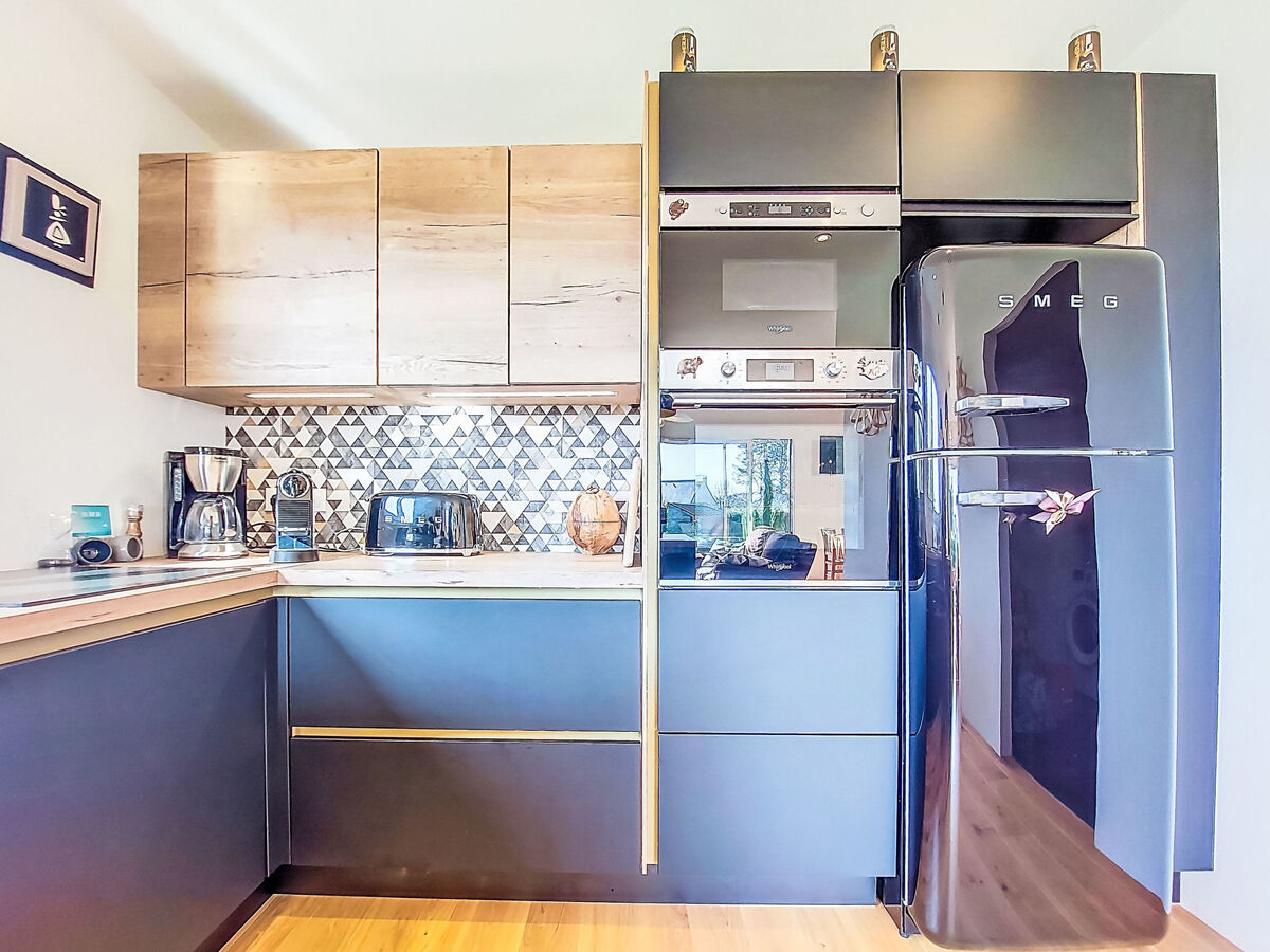 Cuisine ouverte (four, lave-vaisselle, 4 plaques à induction, grille-pain, bouilloire électrique, micro-ondes, congélateur, cafetière électrique).