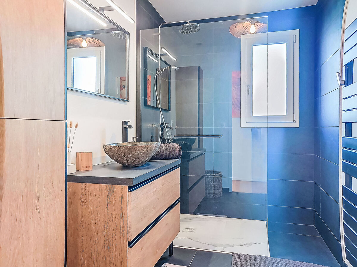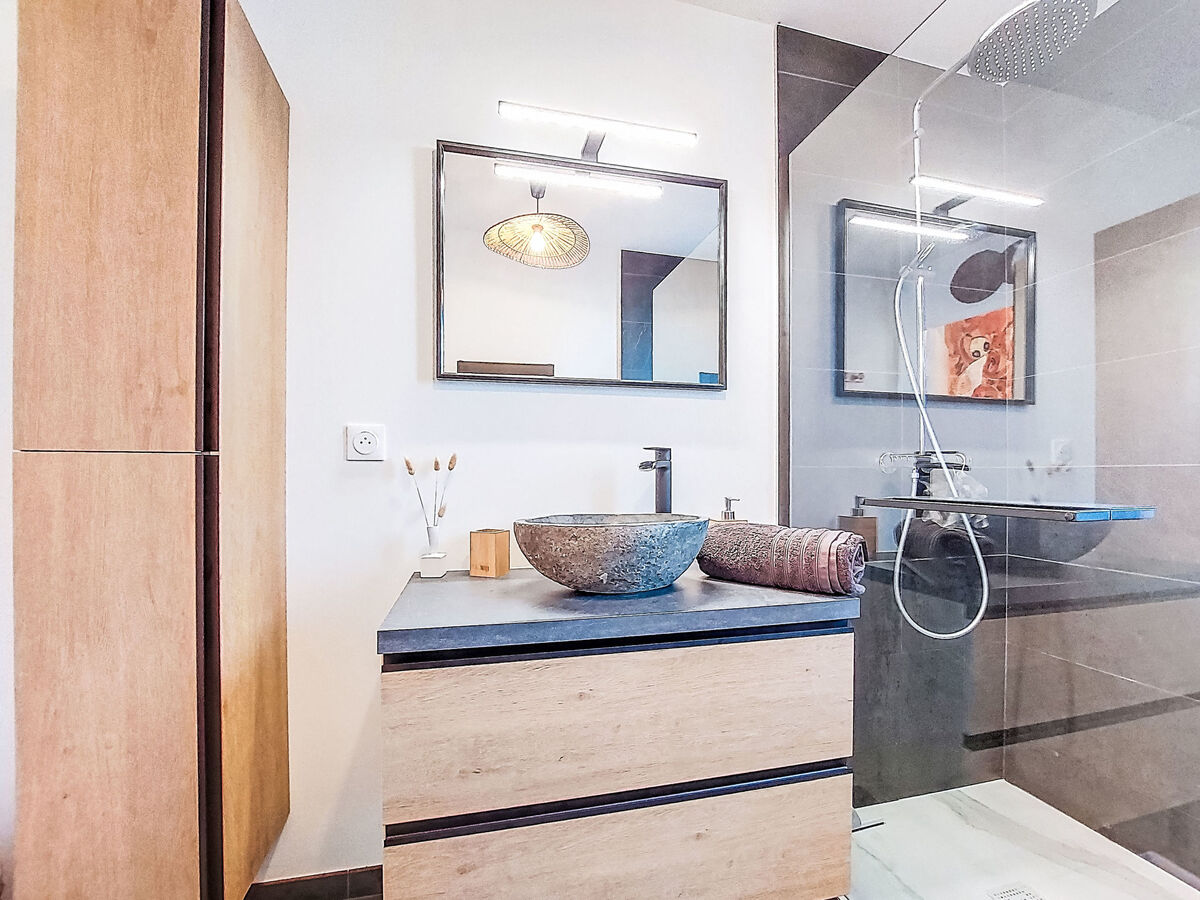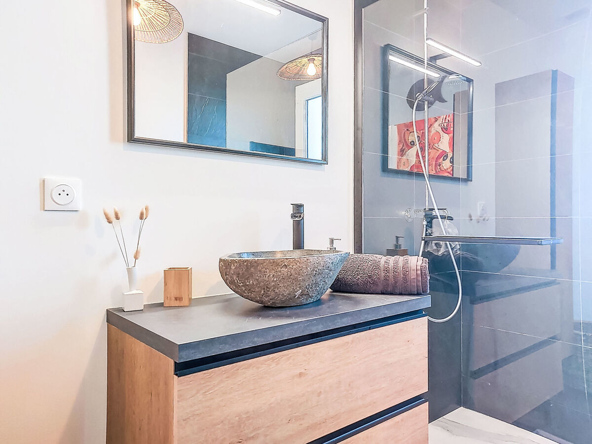 Cuisine ouverte (four, lave-vaisselle, 4 plaques à induction, grille-pain, bouilloire électrique, micro-ondes, congélateur, cafetière électrique).
