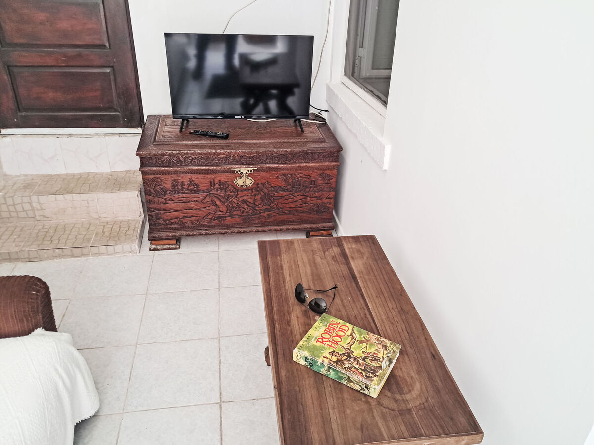 Aménagement simple: séjour/salle à manger avec TV (câblée) et écran plat.