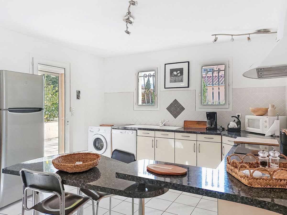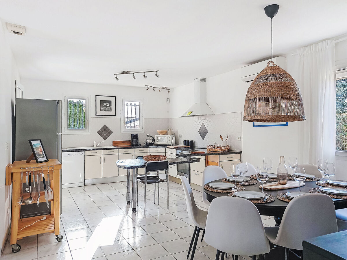 Coin cuisine (four, lave-vaisselle, 3 plaques à induction, grille-pain, bouilloire électrique, micro-ondes, congélateur, cafetière électrique).