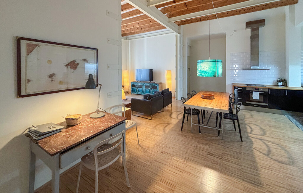 Entrez et laissez-vous accueillir par le vaste espace de vie. De hauts plafonds avec des poutres en bois apparentes et de grandes fenêtres créent une atmosphère agréable. Prenez place sur les canapés et détendez-vous dans un environnement calme. Le plan ouvert relie le salon, la salle à manger et la cuisine et permet de se réunir en toute convivialité. Profitez de la longue table en bois pour prendre vos repas ensemble ou pour passer des soirées tranquilles en famille. La cuisine moderne, avec ses vastes plans de travail, offre de bonnes conditions pour les soirées de cuisine en commun.