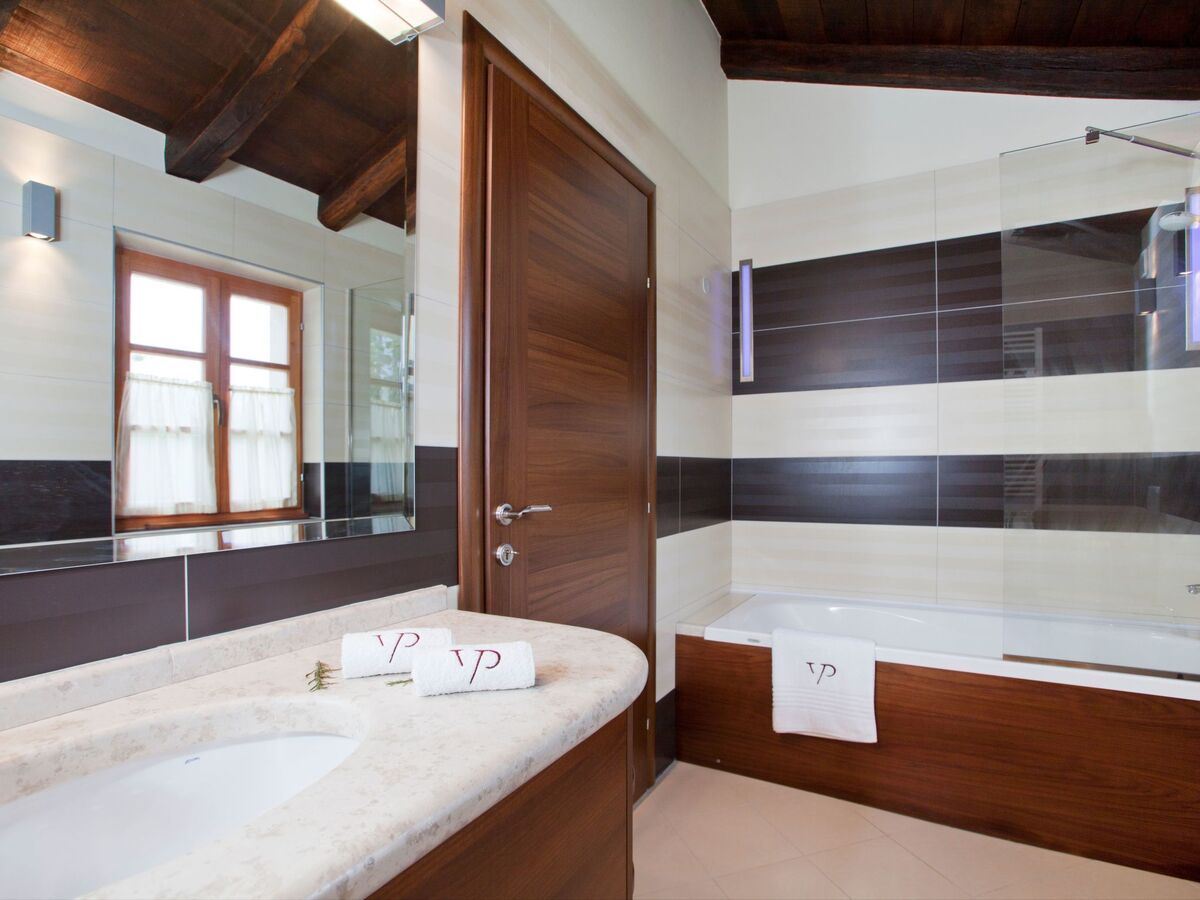 1 chambre avec 1 grand-lit (180 cm, longueur 220 cm), bain/bidet/WC, double vasque et air-conditionné.