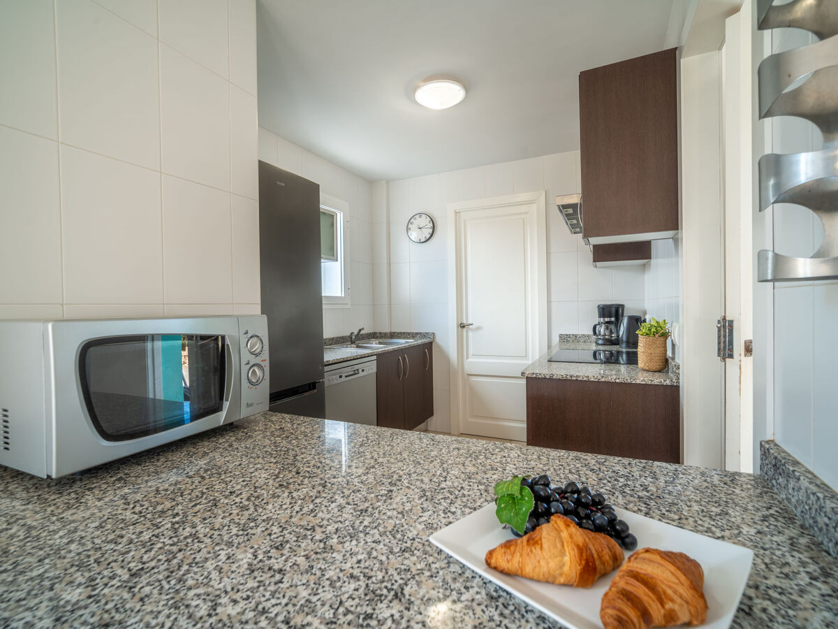 Cuisine ouverte (four, lave-vaisselle, 4 plaques vitrocéramiques, grille-pain, bouilloire électrique, micro-ondes, cafetière électrique).
