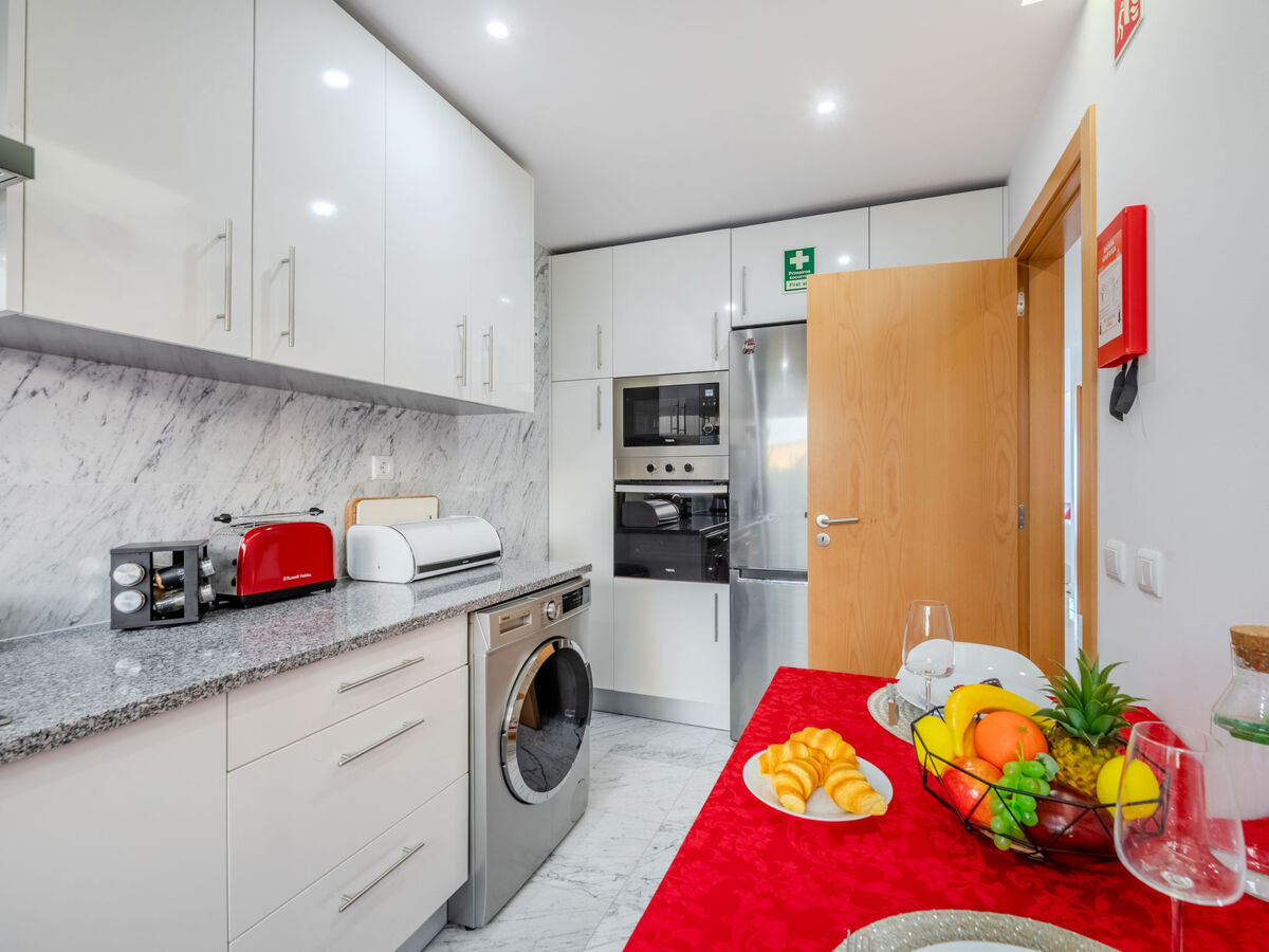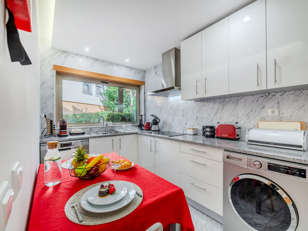 Cuisine (four, lave-vaisselle, 4 plaques à induction, grille-pain, bouilloire électrique, micro-ondes, congélateur, cafetière électrique, Capsules pour machine à café (Nespresso not incl.)) avec cheminée (uniquement à titre de décoration).