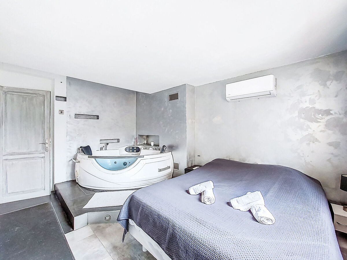À l'étage supérieur: 1 chambre avec 1 grand-lit (140 cm, longueur 190 cm) avec baignoire d'angle, TV et air-conditionné.
