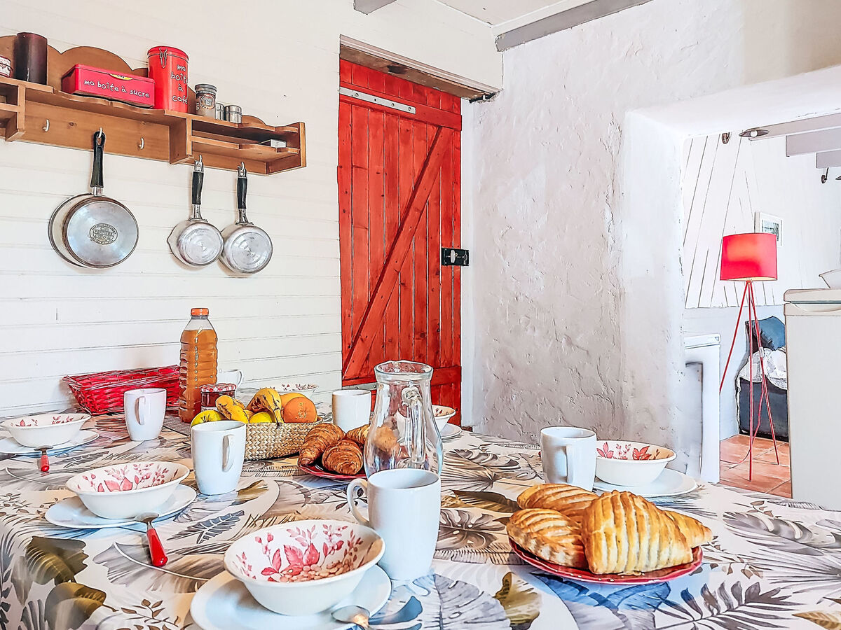 Cuisine ouverte (four, 4 feux, grille-pain, bouilloire électrique, micro-ondes, congélateur, cafetière électrique, Capsules pour machine à café (nespresso) (NON INCLUSES), appareil à raclette) avec table pour les repas.