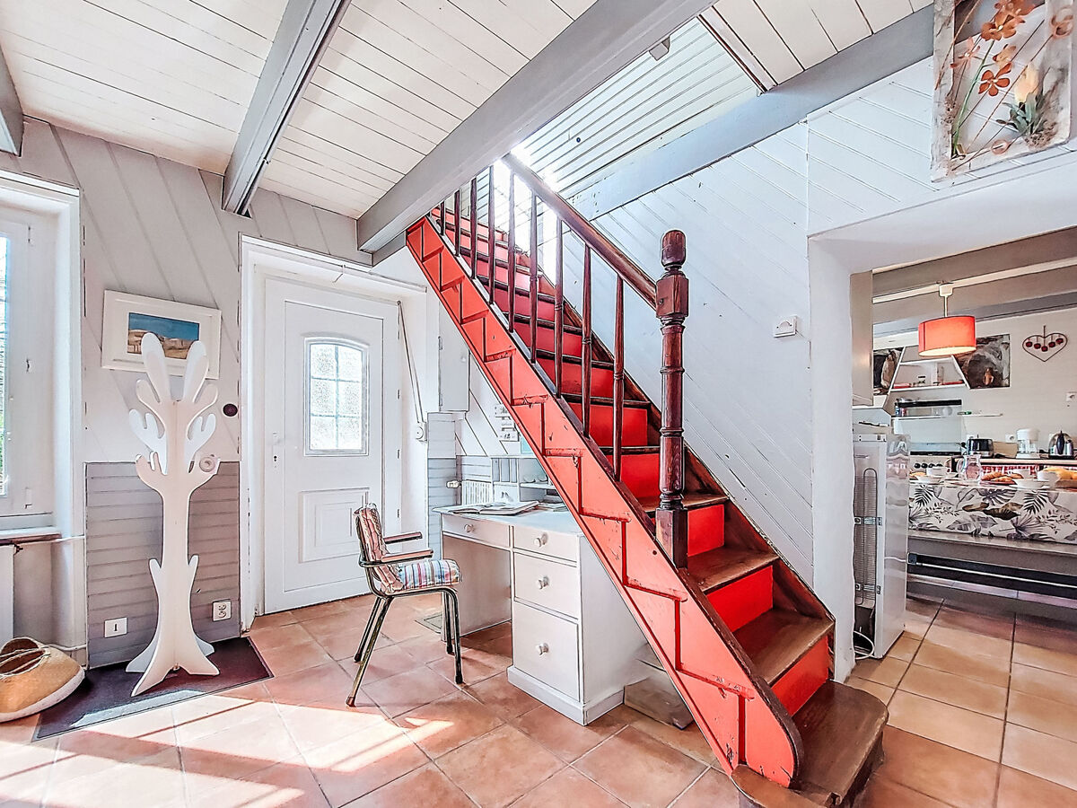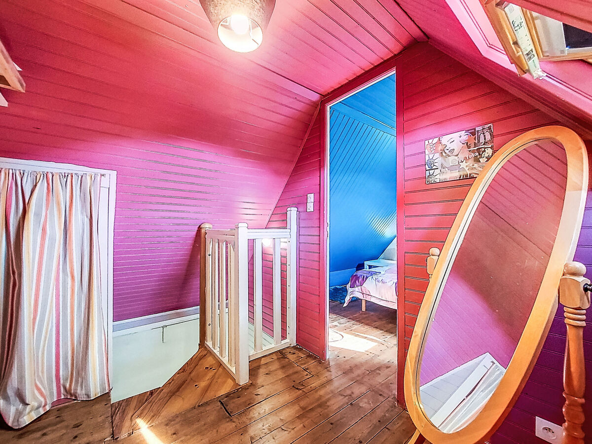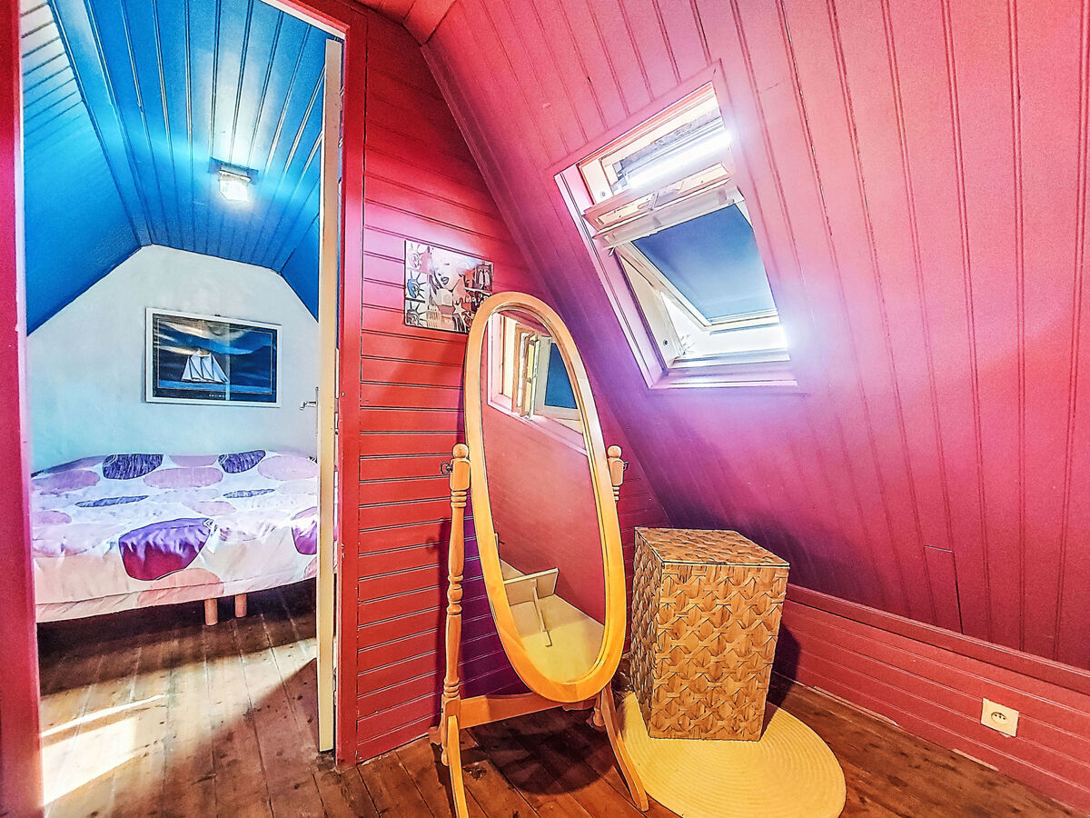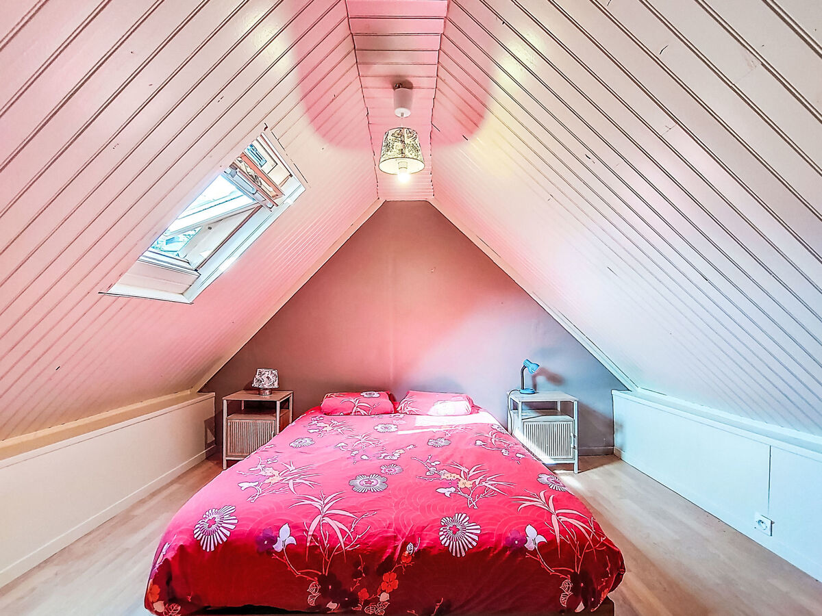 À l'étage supérieur: (escalier raide) mansardé 1 chambre avec 1 grand-lit (140 cm, longueur 190 cm).