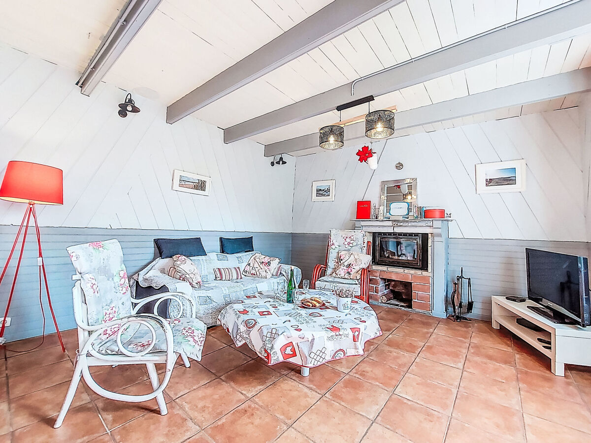 Aménagement simple et plaisant: séjour/salle à manger avec cheminée et TV (écran plat), radio.