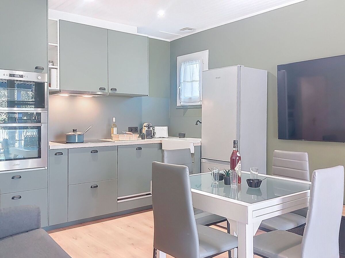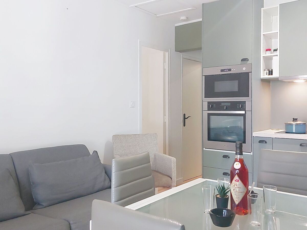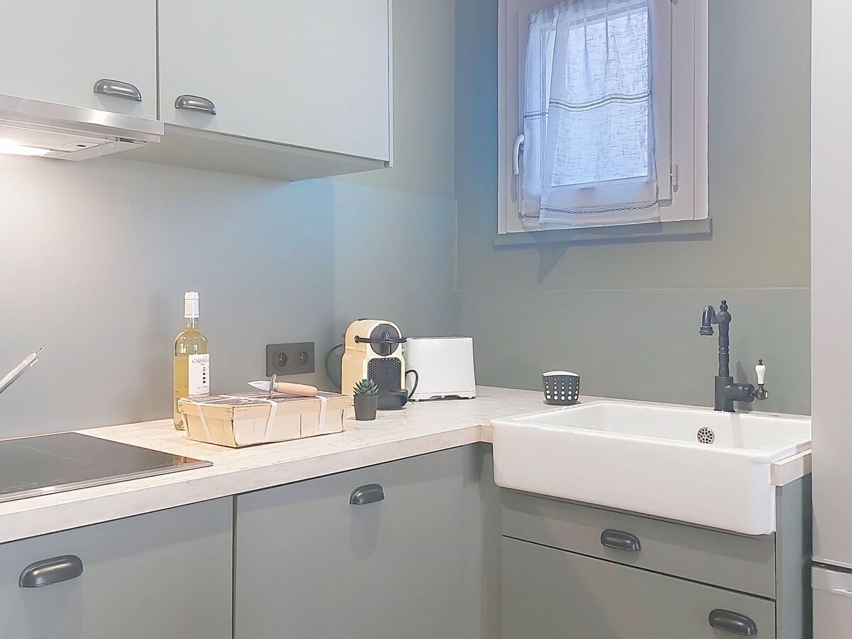 Cuisine ouverte (four, lave-vaisselle, 4 plaques à induction, grille-pain, bouilloire électrique, micro-ondes, cafetière électrique).