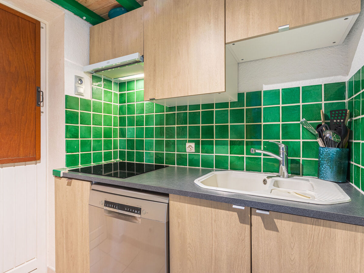 Cuisine ouverte (lave-vaisselle, 4 plaques vitrocéramiques, grille-pain, bouilloire électrique, congélateur, cafetière électrique, Capsules pour machine à café (Nespresso) (NON INCLUSES), combiné micro-ondes) avec coin repas.