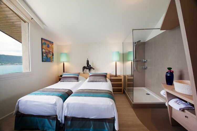 Les pieds dans l’eau, superbe villa 5 étoiles de très haut standing pour 10 personnes. Un cadre exceptionnel avec une vue sur le lac d’Annecy et les montagnes environnantes à vous couper le souffle. Métamorphosée par un architecte et designer de renom, la maison mêle avec bonheur décoration contemporaine, mobilier design et hospitalité. Un refuge idéal où la perfection se veut la norme. Face au lac, la zone détente et son jacuzzi 5 places vous apporterons des moments de relaxation et de bien être dont nous avons tous tant besoin durant les vacances. Notre plage et ponton privés vous attendent et si vous possédez un bateau ou si vous souhaitez en louer un, vous disposerez de notre boucle d’amarrage. Idéalement située au cœur des Alpes (Genève 45 mn, Megève, Chamonix, Italie 1h, Méribel, Courchevel 1h30, Val d’Isère 2h), notre maison est également proche de toutes les commodités. Vous serez à 10 minutes du centre-ville d’Annecy et de ses commerces, à 15km de l’aéroport d’Annecy, 45km de celui de Genève en Suisse et 150km de celui de Lyon Satolas. Pour les amateurs de sports, notre maison est au cœur de toutes les activités : voile, ski nautique, wake-board, plongée, golf, équitation, luge d’été, tennis, randonnée, VTT, parapente, karting, … En saison d'hiver, les superbes stations de ski comme le Grand Bornand et la Clusaz (Annecy Ski Resorts), seront accessible en seulement 30 minutes. Vous y pratiquerez le ski alpin, le snow board, le ski de fond, la raquette, la moto neige, les balades en chiens de traineaux, … Vous aimerez: - Villa 5 étoiles de 250m² pour 10 personnes exposée Sud-ouest - Parc de 1000m² - 5 chambres équipées d’une literie qualité « Palace» pour votre plus grand confort avec vue sur le lac. - Cuisine équipée (plaque vitrocéramique, four électrique, micro-ondes, lave-vaisselle, réfrigérateur /congélateur, …) - Salon et salle à manger s’ouvrant sur une vaste terrasse de 100 m² face au lac - Salle de cinéma avec projecteur et grand écran - TV dans chaque chambre, home cinéma, deux lecteurs DVD, chaînes satellites et lecteur Ipod - Connexion Internet haut débit - Coffre-fort hôtel - Deux salles de bain et deux salles d’eau, - Quatre WC - Buanderie avec machine à laver et sécher le linge ; table et fer à repasser - Grande table extérieure, salon de jardin et chaises longues - BBQ et plancha - Plage, ponton et boucle d’amarrage privés - Garage privatif et parking 3 places - Lit Bébé, chaise haute, petite baignoire et poussette canne sur demande