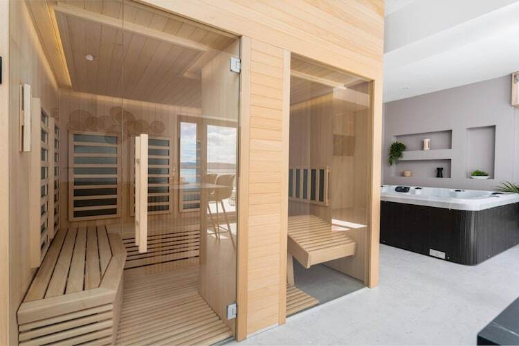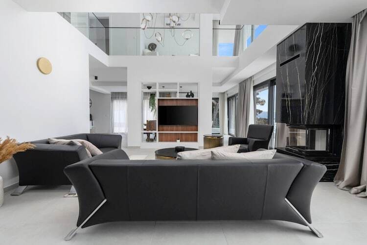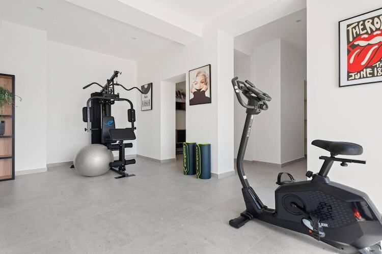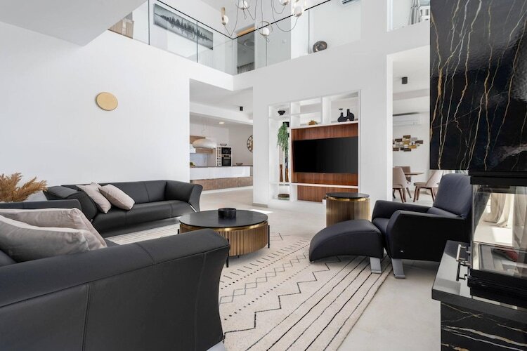 L'espace bien-être dédié, situé au rez-de-chaussée, est conçu pour une détente absolue. Vous pourrez y passer d'une séance dans la salle de sport ultramoderne à la chaleur apaisante du sauna finlandais, puis vous relaxer dans le jacuzzi intérieur-extérieur. L'accès à l'extérieur se fait en toute fluidité, donnant sur une vaste piscine de 55 m² entourée d'élégants transats et d'une pergola ombragée. Pour ceux qui aiment recevoir, le premier étage propose un salon raffiné avec canapés en cuir noir et cheminée, ainsi qu'une cuisine design équipée d'un réfrigérateur double et d'un coin café.