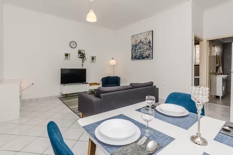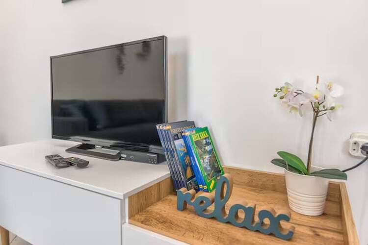 À l'intérieur, l'appartement dispose d'un espace de vie lumineux et ouvert comprenant un coin salon et un coin repas, ainsi qu'une télévision pour des soirées de détente après une journée passée au grand air. Une cuisine moderne entièrement équipée comprend un réfrigérateur, un four, des plaques de cuisson, un micro-ondes, un lave-vaisselle et tous les ustensiles de cuisine nécessaires, permettant aux hôtes de préparer facilement leurs repas durant leur séjour. Une chambre double spacieuse et bien agencée garantit des nuits reposantes, tandis qu'une salle de bain avec douche apporte un confort optimal. La climatisation est disponible pour un confort optimal pendant les mois les plus chauds, tandis que la connexion Wi-Fi et un lave-linge ajoutent à la praticité au quotidien pour les longs séjours.