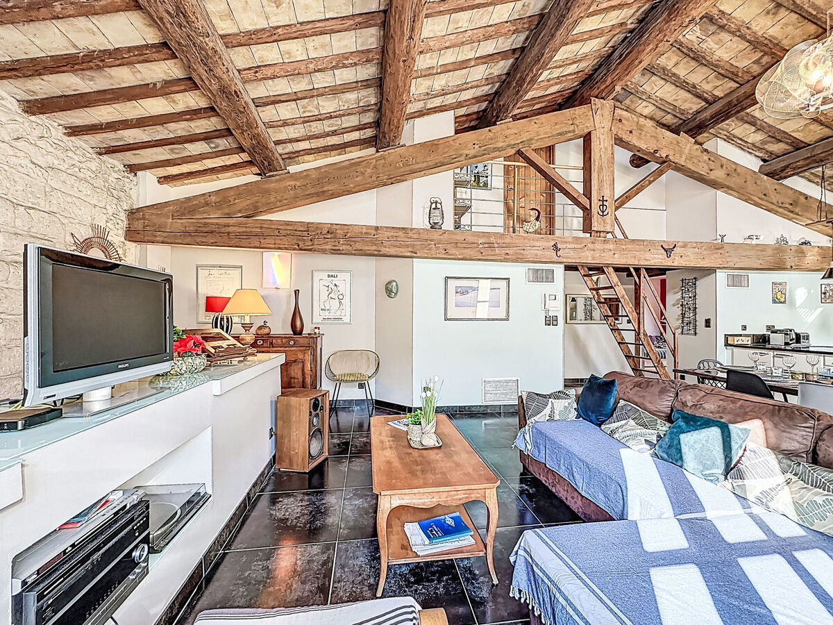 Séjour/salle à manger avec table pour les repas et TV (écran plat).