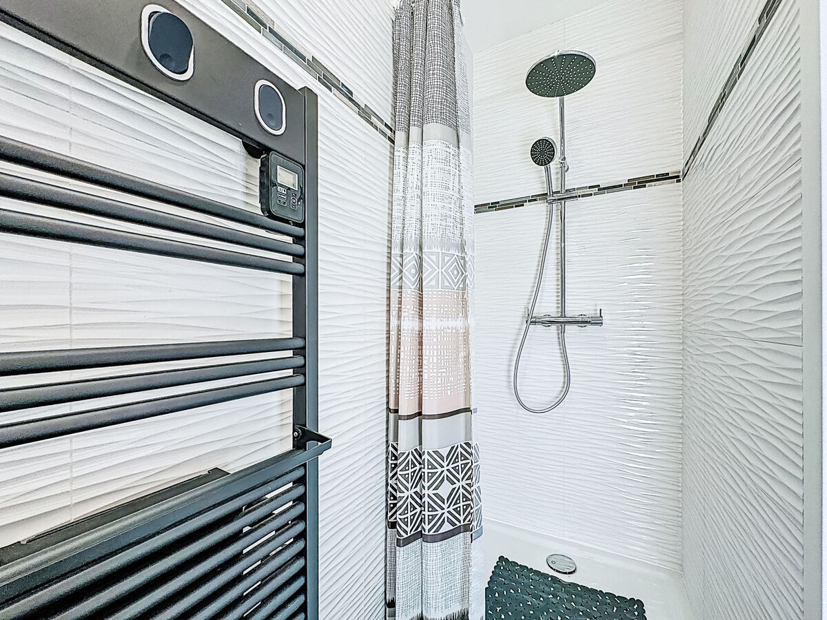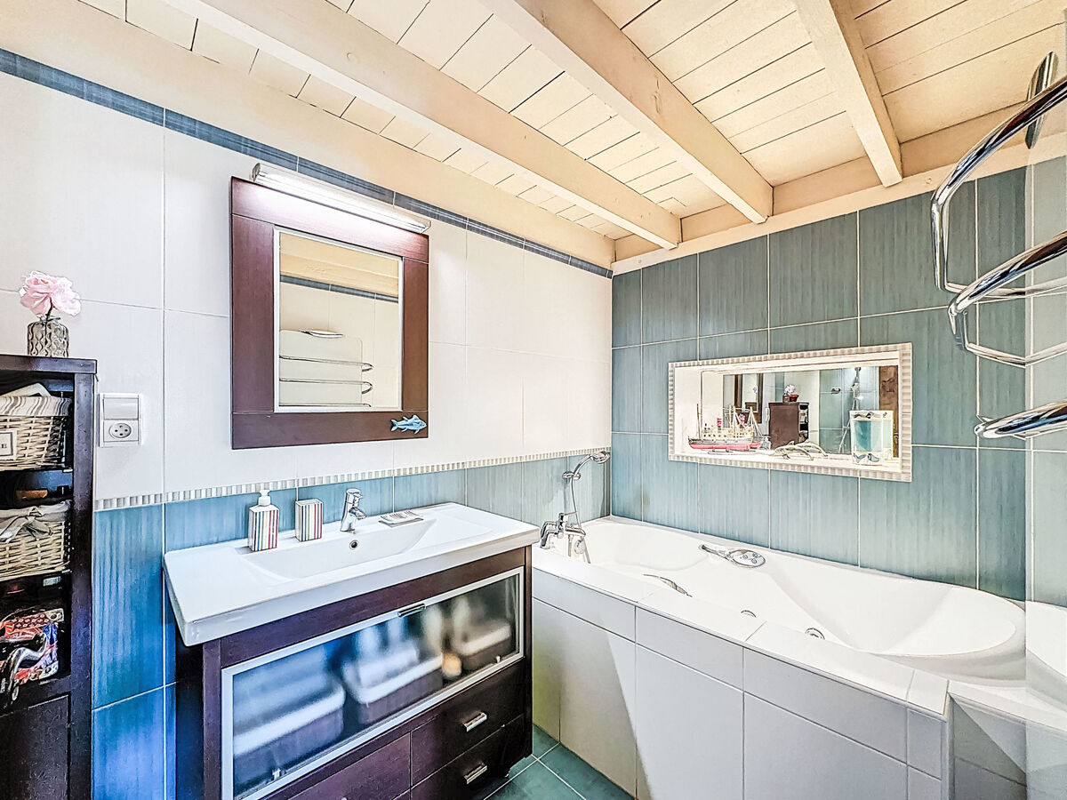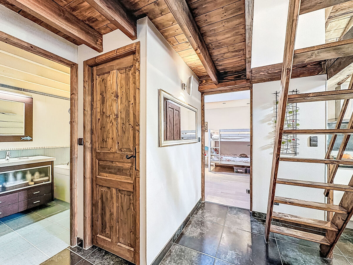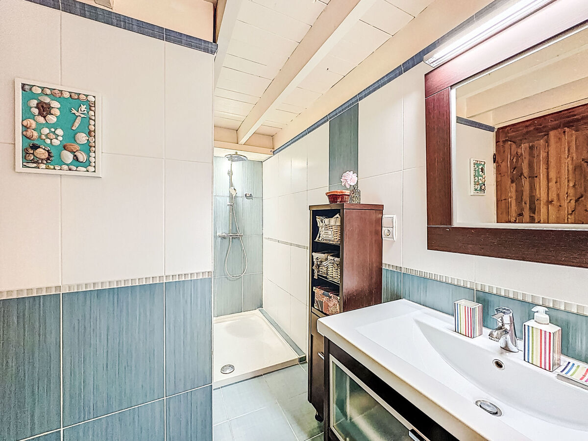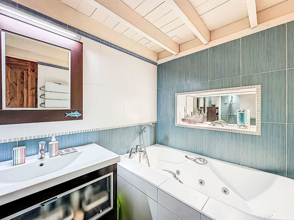 À l'étage inférieur: 1 chambre avec 1 grand-lit (140 cm, longueur 190 cm), douche.