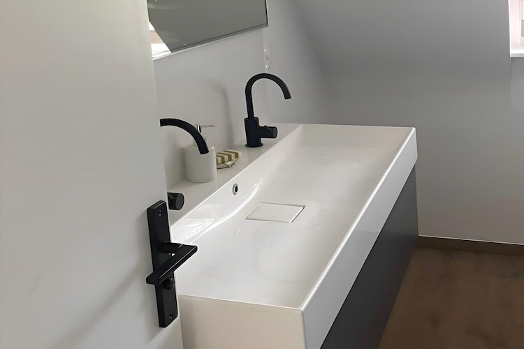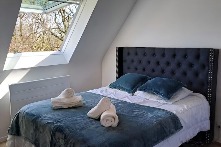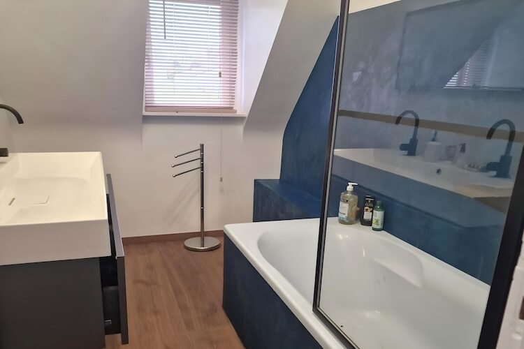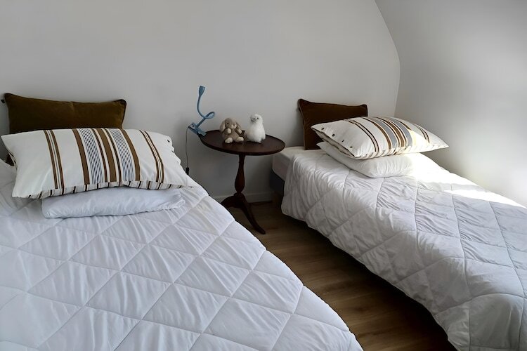 À l’étage, trois chambres accueillantes : une grande chambre avec bureau et lit double (180 cm), une avec lit double (160 cm) et une avec deux lits simples (90 cm). Une seconde salle de bain avec baignoire et des WC séparés complètent l’ensemble.