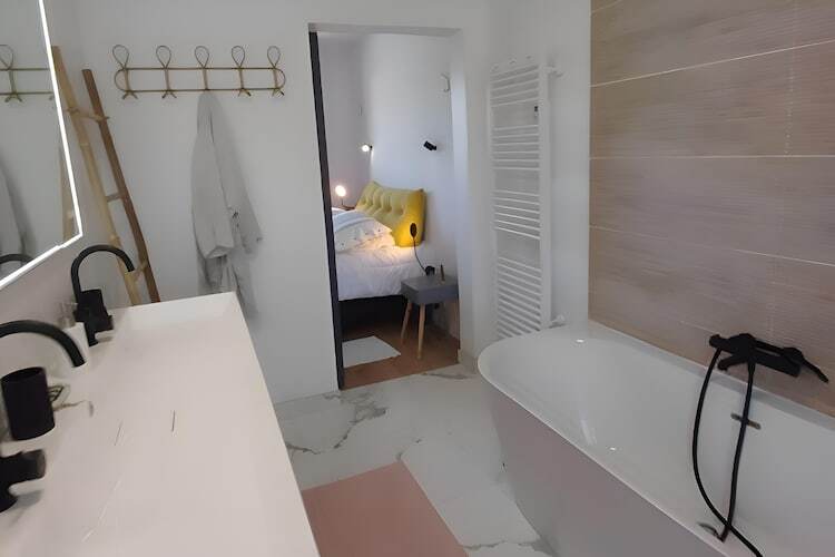 Au rez-de-chaussée, une chambre avec lit double (160 cm) et vue mer dispose de sa salle de bain attenante (douche, baignoire, double vasque) et WC séparés.