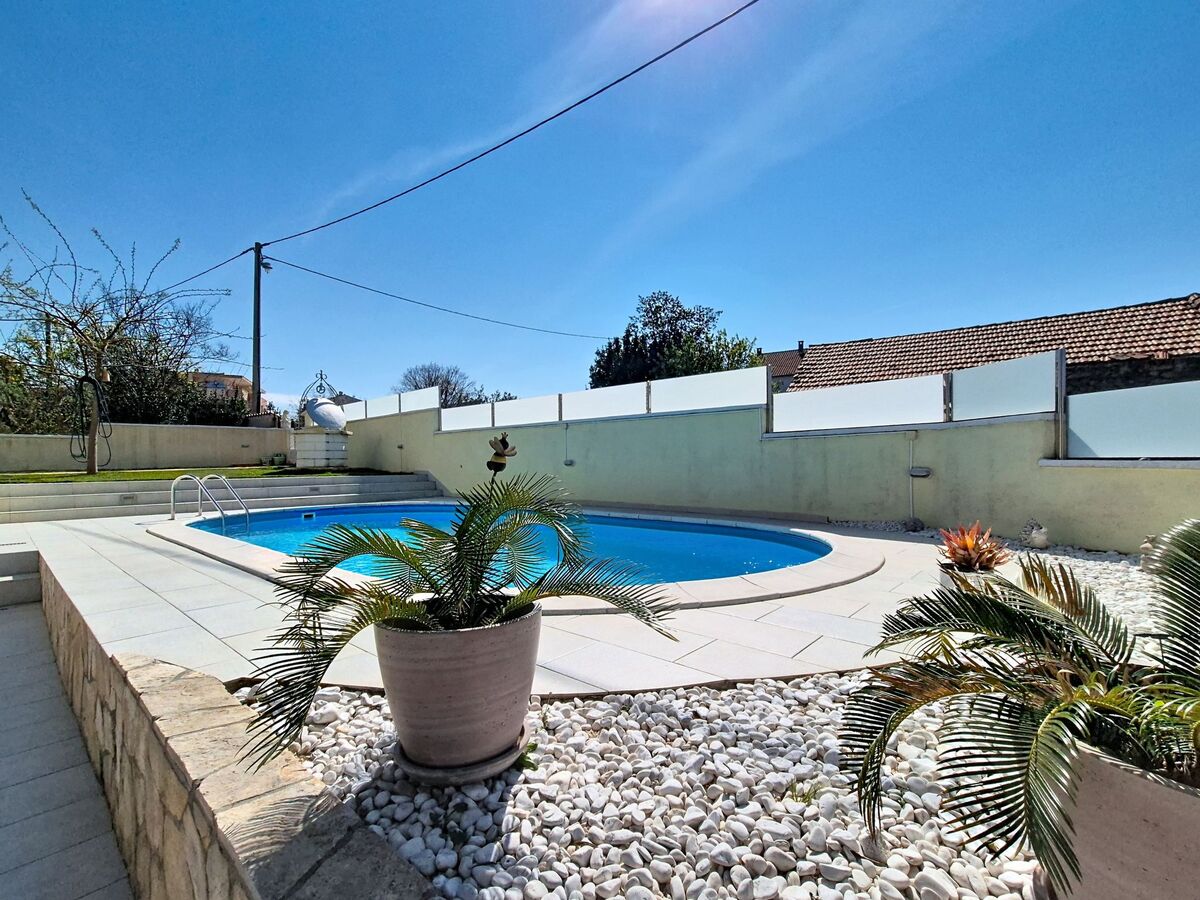 A usage privé: terrain 600 m2 (clôturé), piscine (33 m2, profondeur 150 cm, disponibilité saisonnière: 27.Avr.