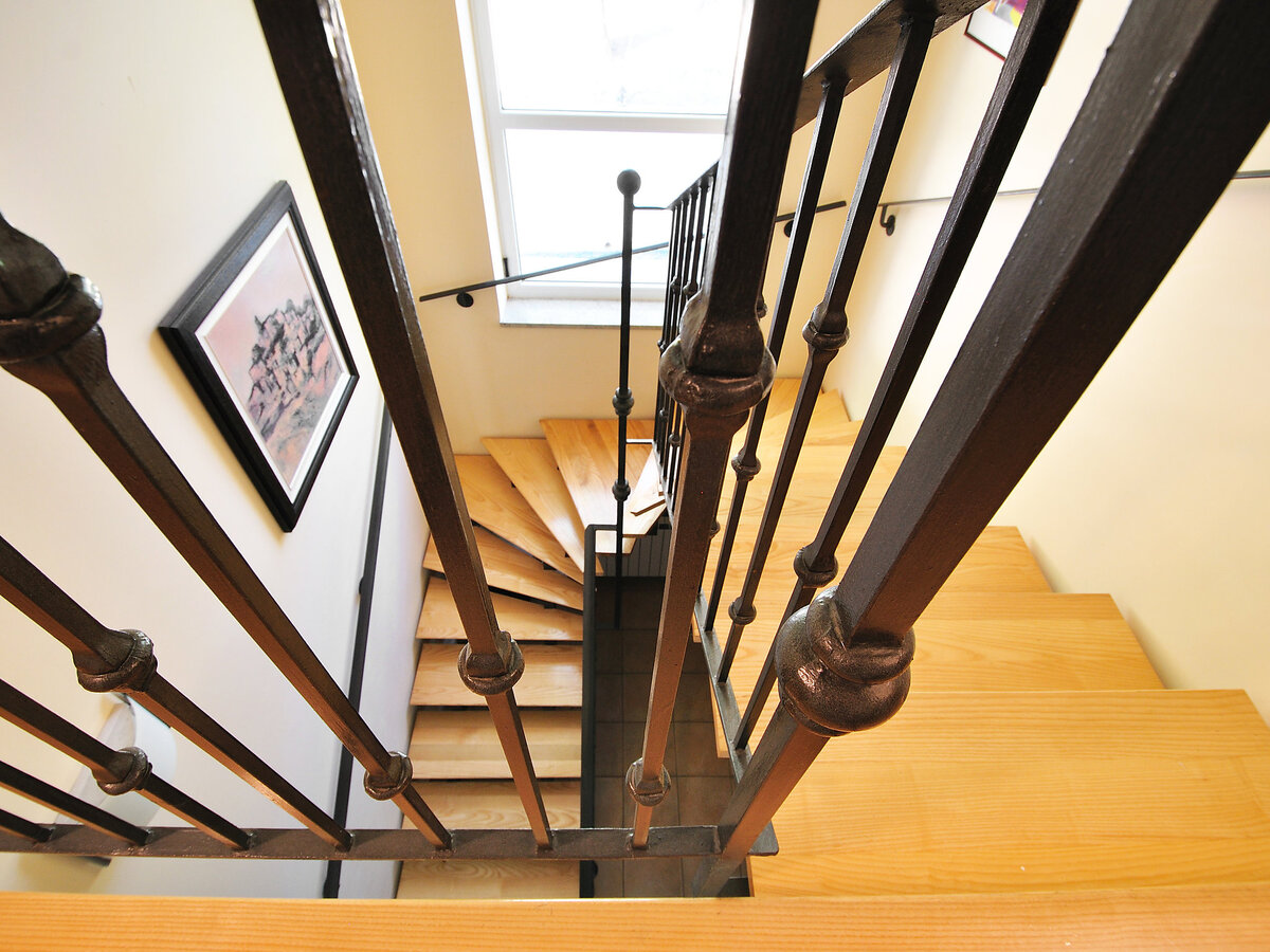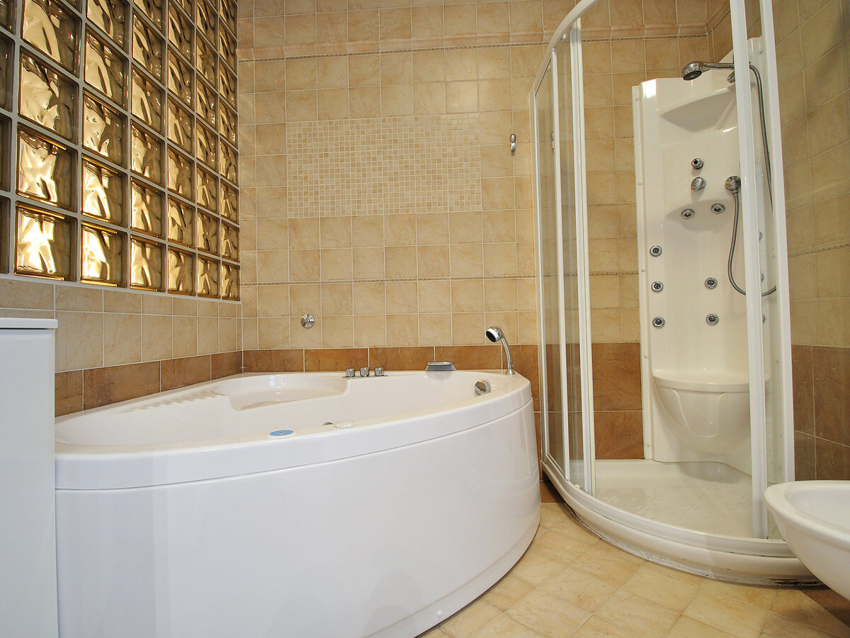 À l'étage supérieur: 1 chambre, mansardée hauteur plafond 160 - 250 cm avec 1 grand-lit (160 cm, longueur 200 cm), bain/douche/WC, douche à jets et bain à remous .