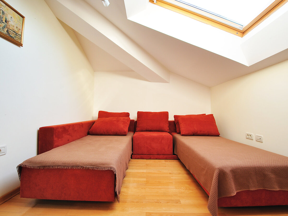 1 chambre, mansardée hauteur plafond 160 - 250 cm avec fenêtre sous le toit avec 2 lits (80 cm, longueur 190 cm).