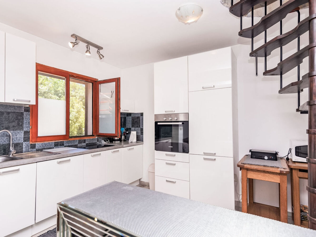 Cuisine ouverte (four, lave-vaisselle, 4 plaques vitrocéramiques, congélateur).