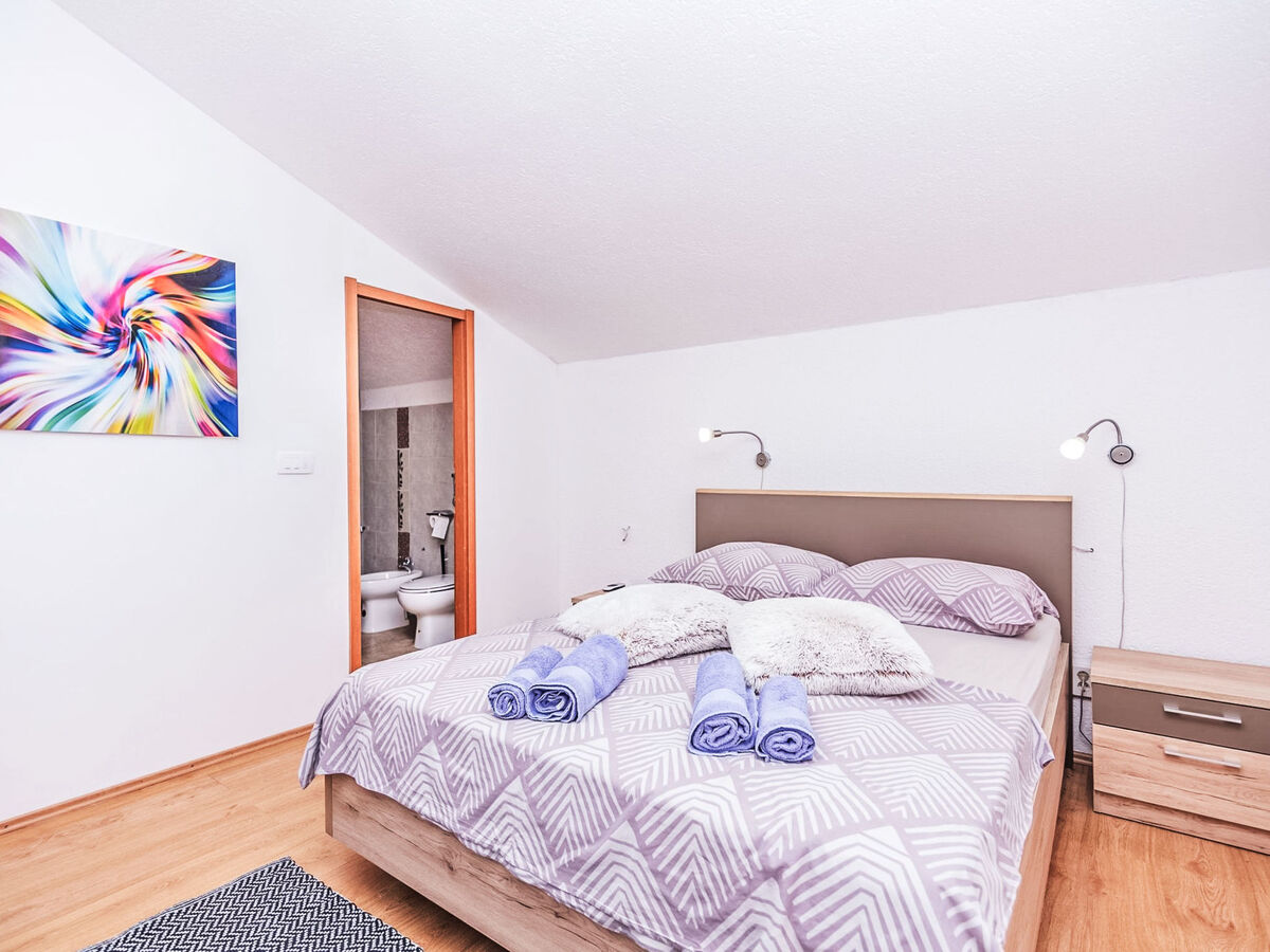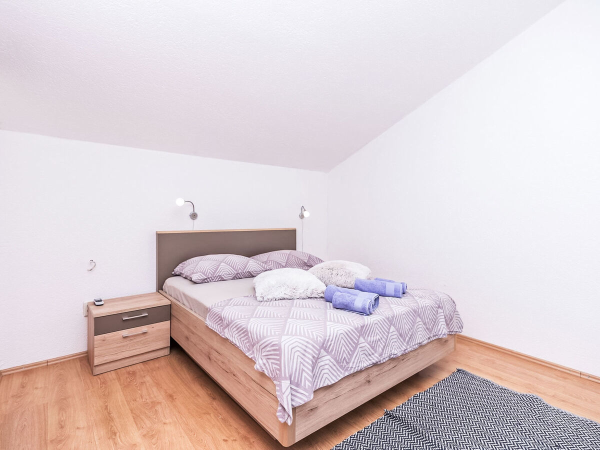 1 chambre avec 1 grand-lit (160 cm, longueur 200 cm), douche/WC.