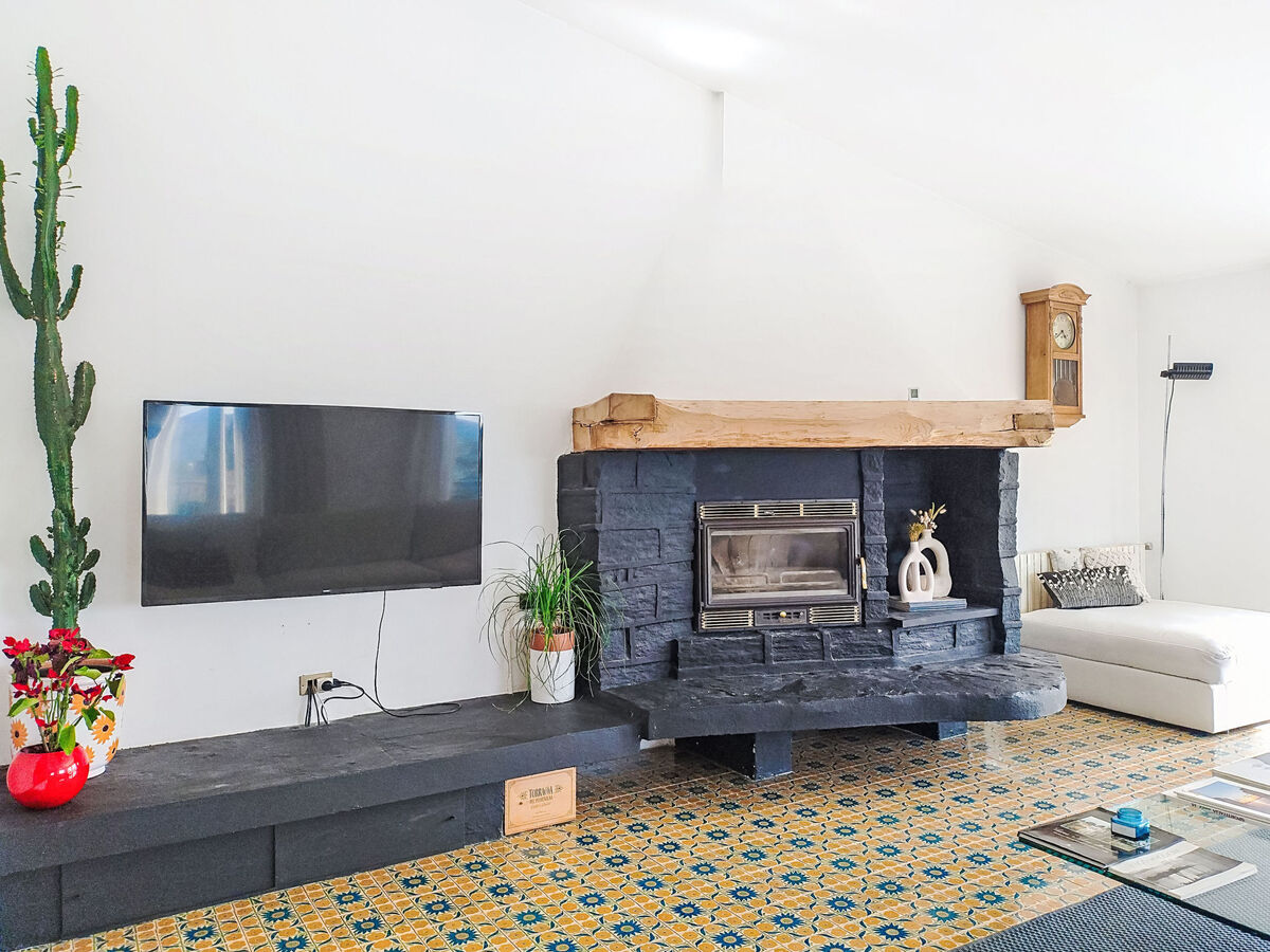 Grand séjour/salle à manger ouvert avec cheminée (uniquement à titre de décoration), TV et ventilateur.