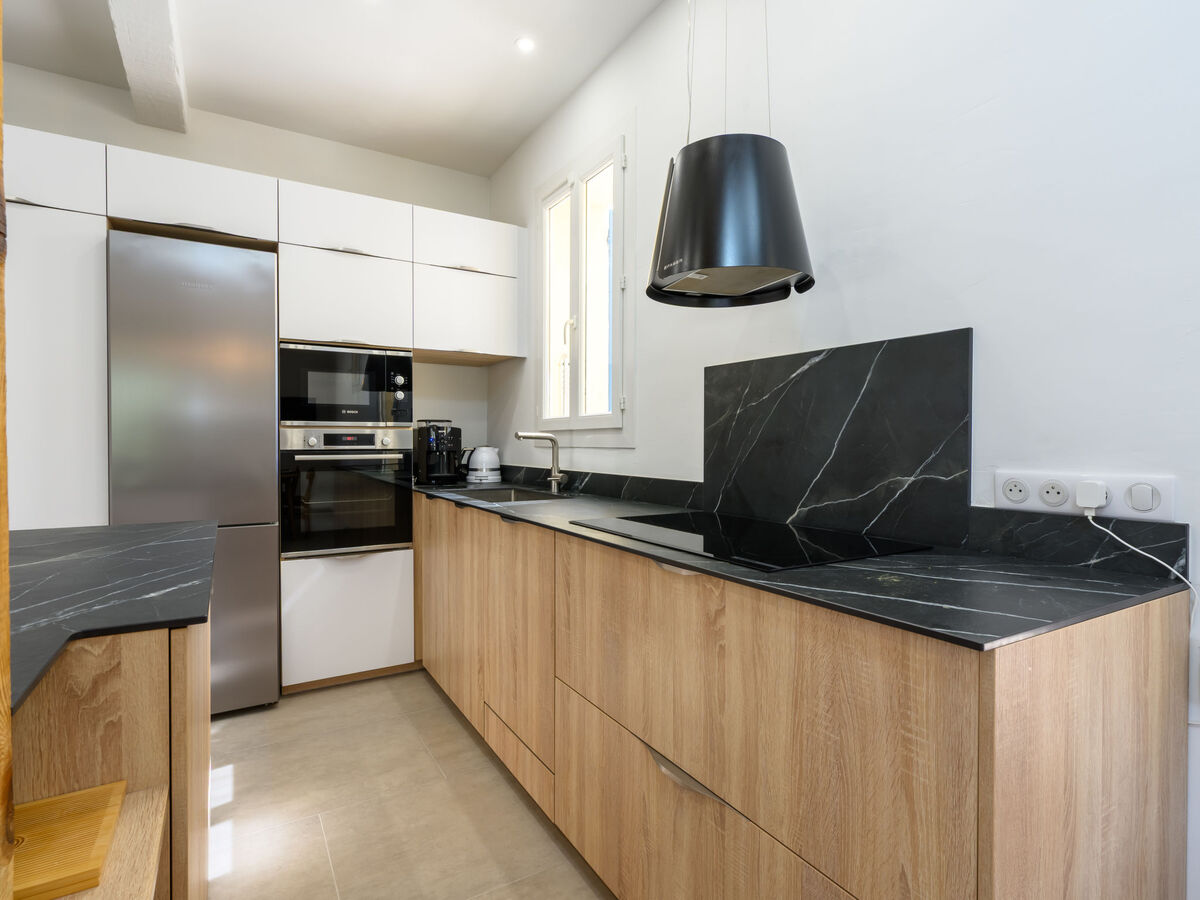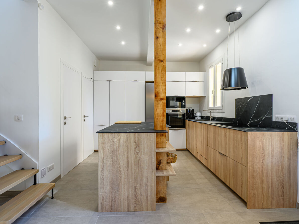 Cuisine ouverte (four, lave-vaisselle, 4 plaques à induction, grille-pain, bouilloire électrique, micro-ondes, congélateur, cafetière électrique).